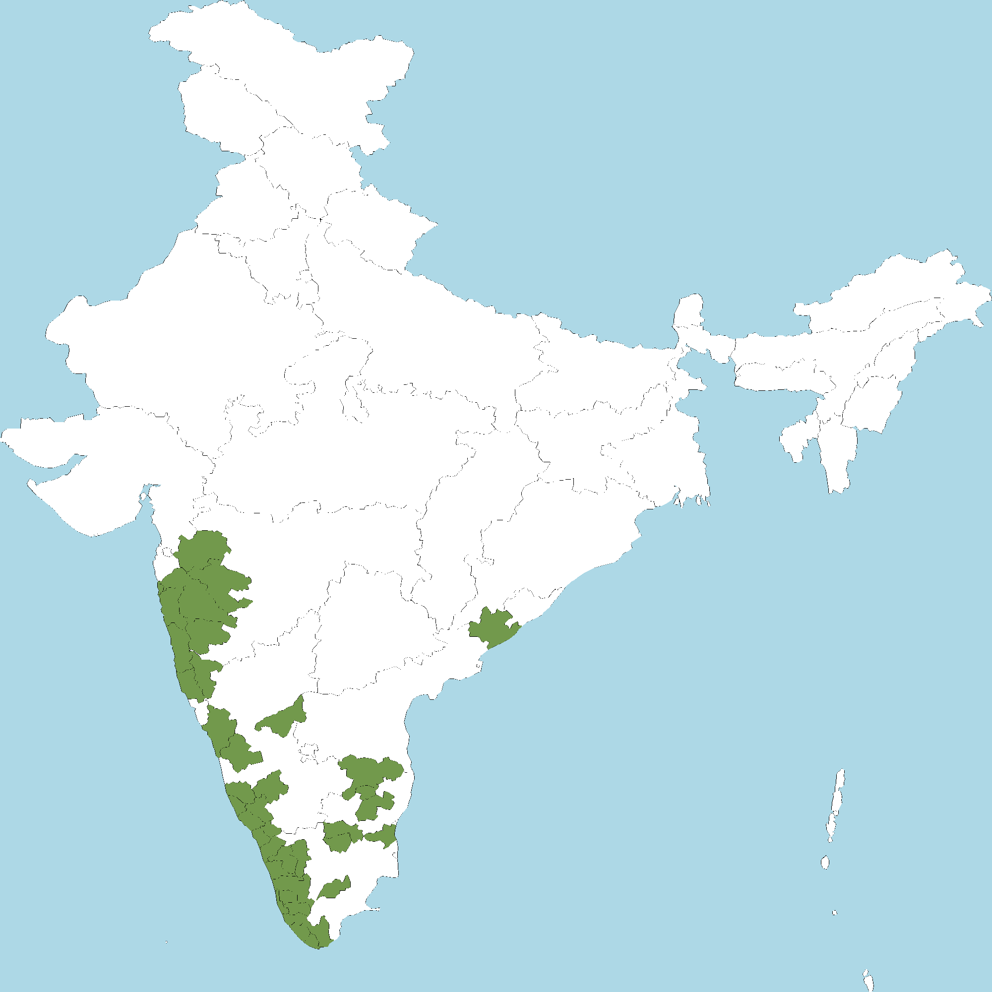 - Tamil Nadu : Kolli Hills (Namakkal district), Alagar Hills (Madurai district), Coimbatore district, Kanyakumari district, Madurai district, The Nilgiri district, Vellore district, Tiruvannamalai district, Salem district, Villipuram district, Cuddalore district, Tiruchirapalli district, Tirunelveli district