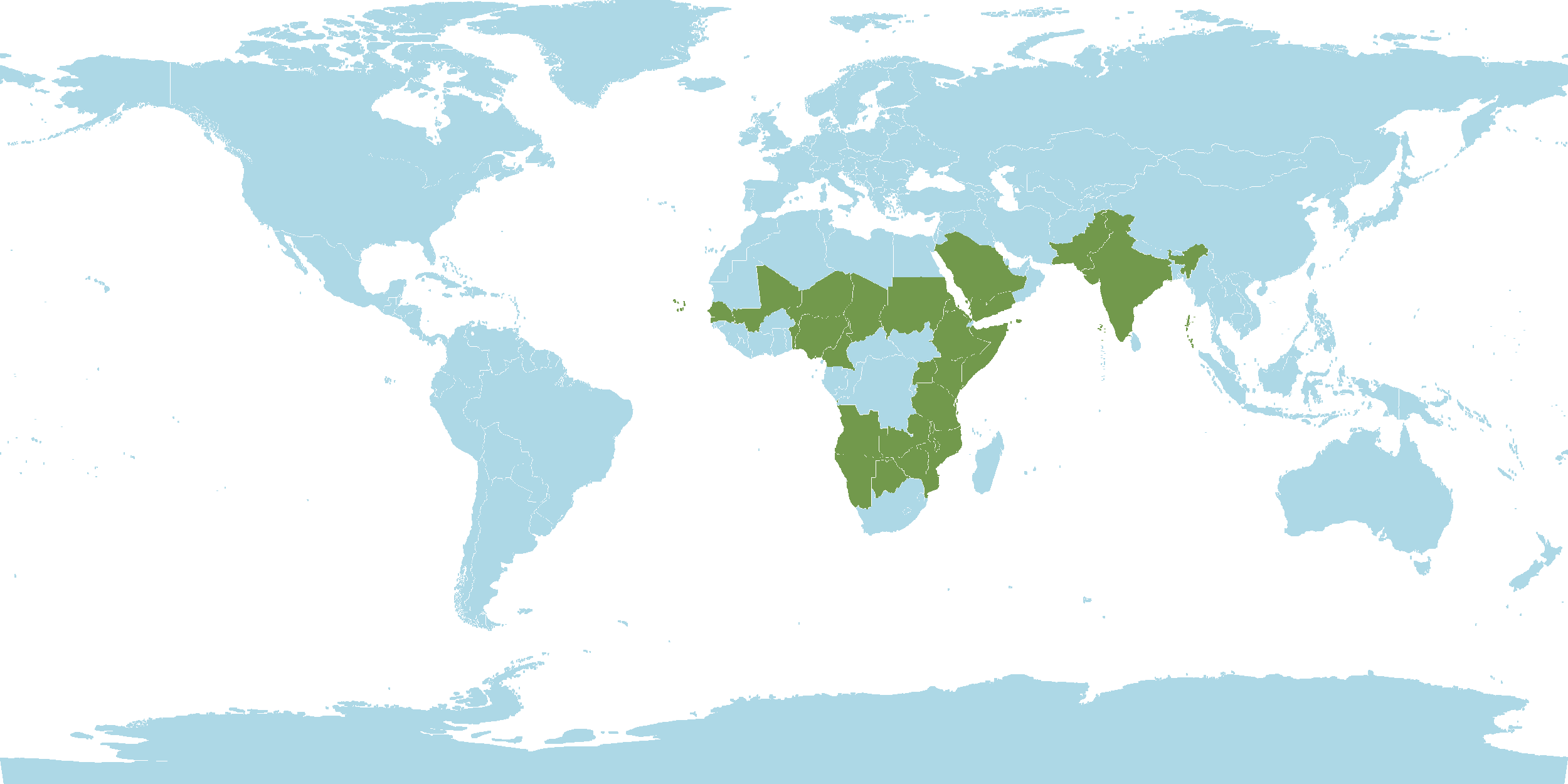- World Distribution : Angola, Benin, Botswana, Burkina, Cameroon, Cape Verde, Central African Repu, Chad, Eritrea, Ethiopia, India, Kenya, Malawi, Mali, Mozambique, Namibia, Niger, Nigeria, Northern Provinces, Pakistan, Saudi Arabia, Senegal, Somalia, Sudan, Tanzania, Uganda, Yemen, Zambia, Zaïre, Zimbabwe