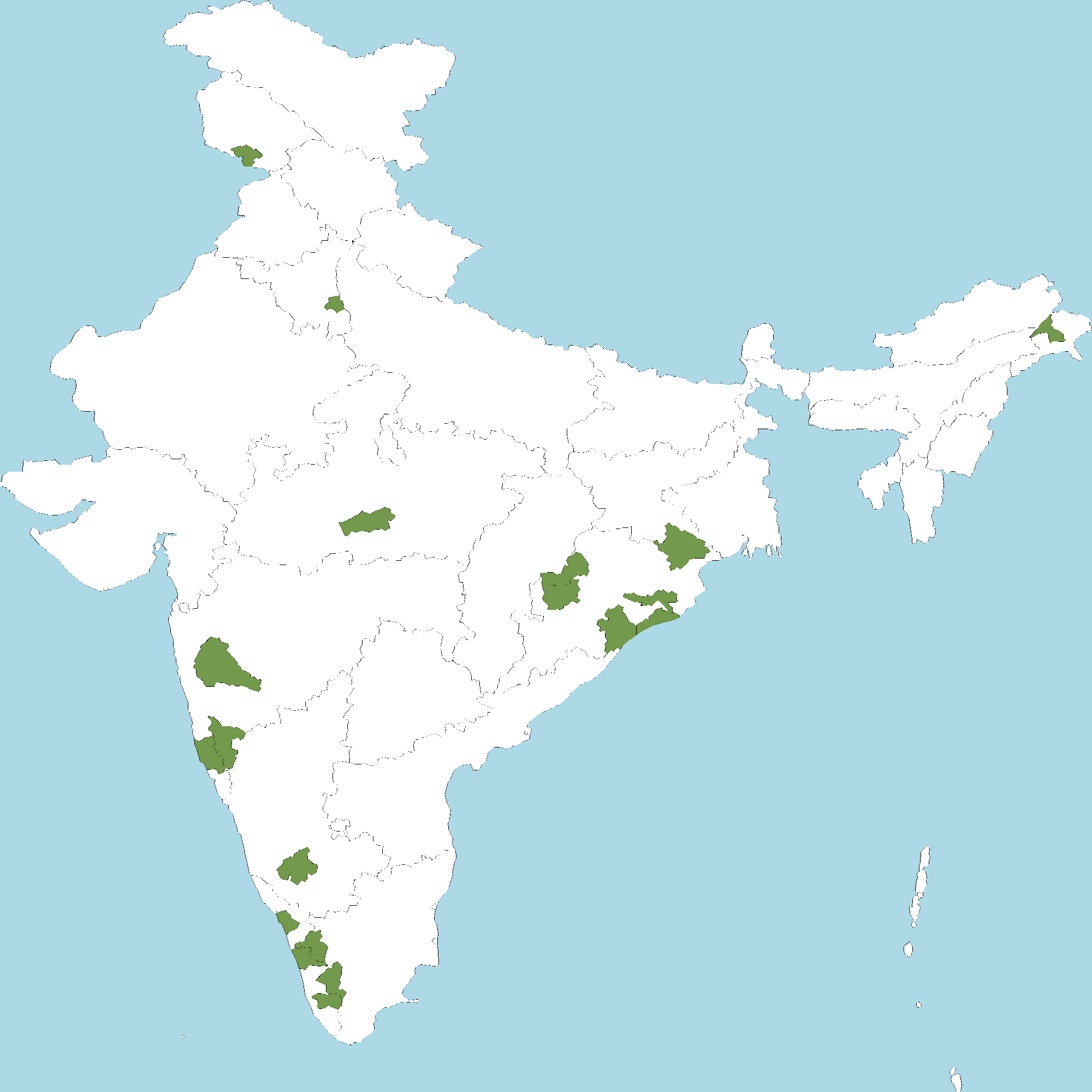 - Kerala : Kozhikode district, Palakkad district, Thrissur district, Idukki district, Pathanamthitta district