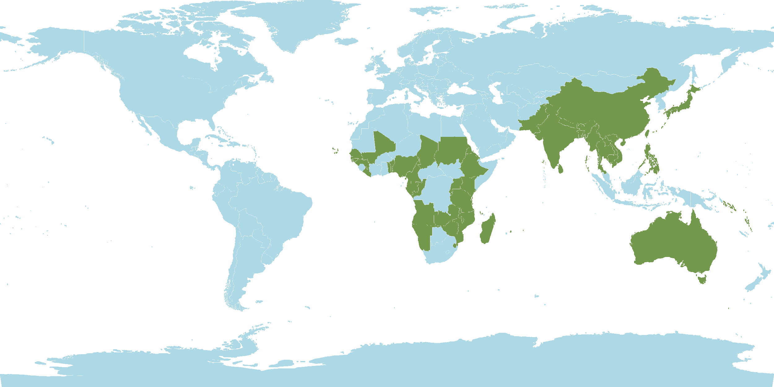 - Native : Angola, Ascension, Australia, Bangladesh, Benin, Bhutan, Bismarck Archipelago, Borneo, Burkina, Burundi, Cambodia, Cameroon, Cape Verde, Central African Repu, Chad, China, Comoros, Congo, Cook Islands, Easter Islands, Equatorial Guinea, Eritrea, Ethiopia,
