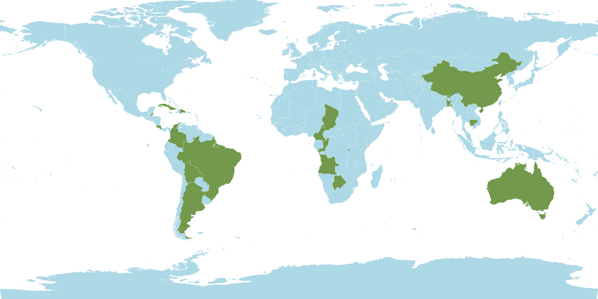 - Native : Angola, Argentina, Australia, Bangladesh, Bhutan, Belize, Bolivia, Borneo, Botswana, Brazil, Burkina, Burundi, Cambodia, Cameroon, Caprivi Strip, Caroline Islands, Central African Repu, Chad, China, Colombia, Congo, Costa Rica, Cuba, Dominican Republic, E
