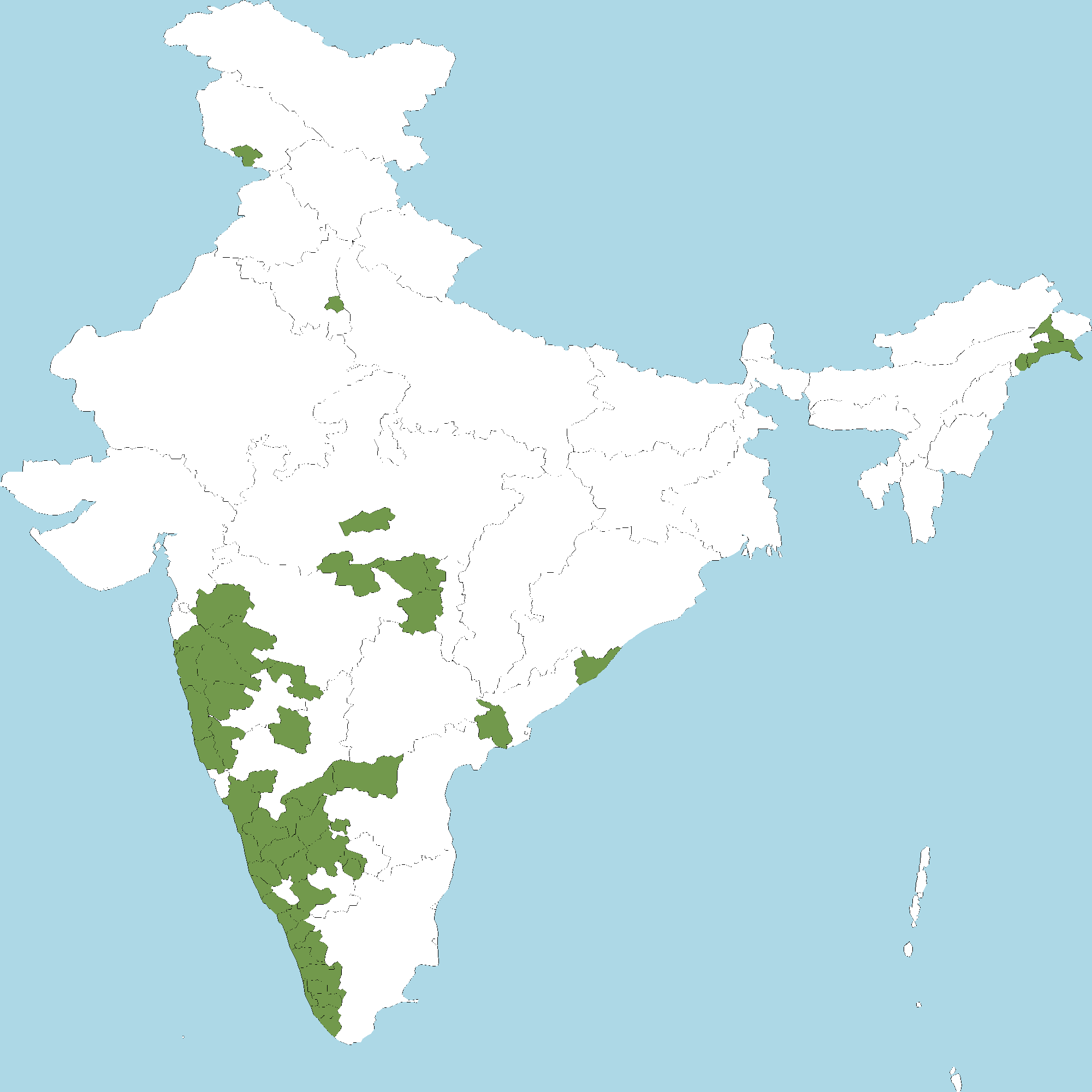 - Tamil Nadu : Plains from the coast; Balaghat and to 1300m on hills