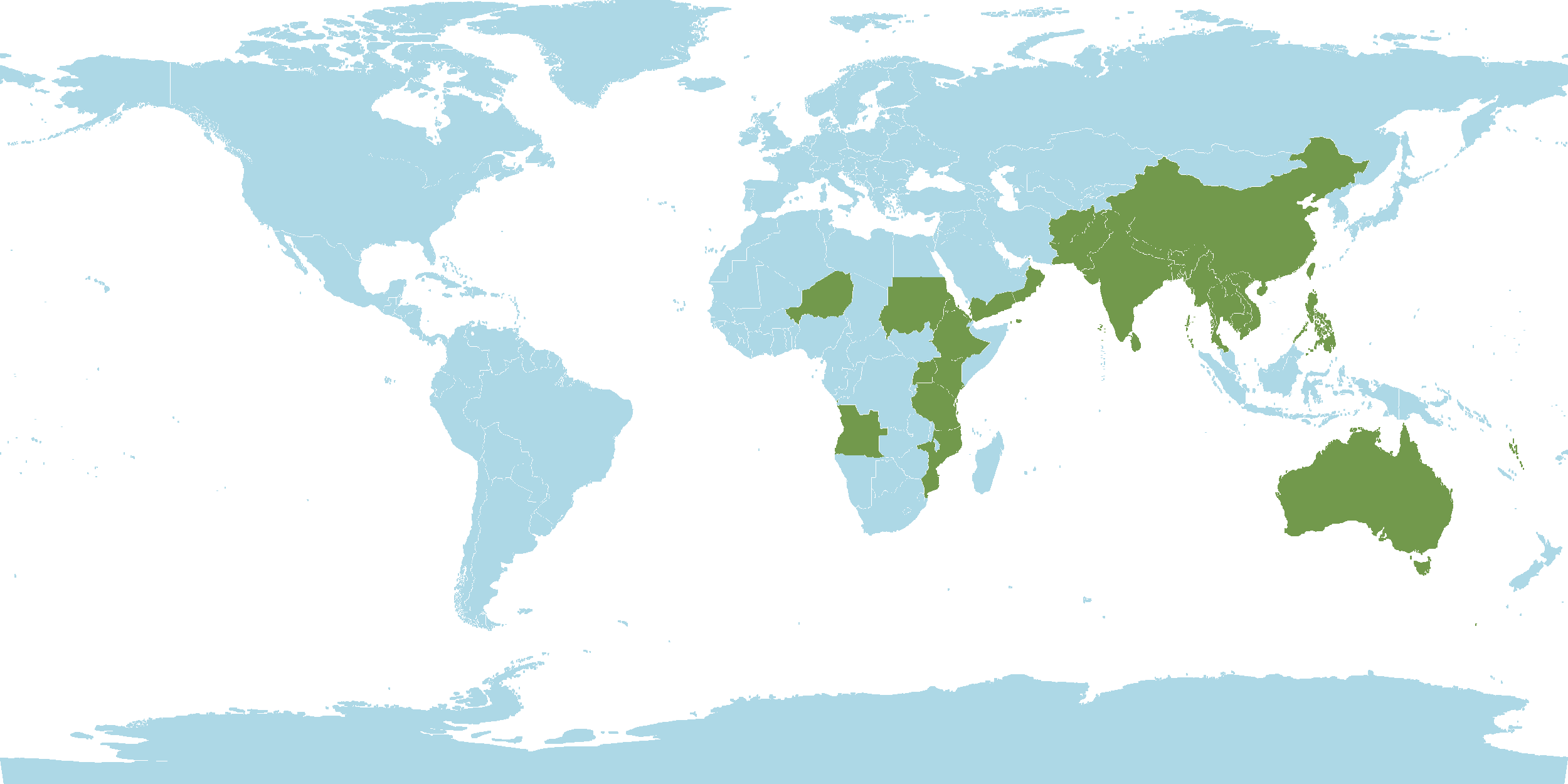 - World Distribution : Afghanistan, Angola, Australia, Bangladesh, Bhutan, Cambodia, China, Eritrea, Ethiopia, Hainan, India, Jawa, Kenya, Lakshadweep Islands, Laos, Lesser Sunda Islands, Mozambique, Myanmar, Nansei-shoto, Nepal, New Guinea, Niger, Oman, Pakistan, Palestine, Philippines, Sri Lanka, Sudan, Sulawesi, Sumatera, Taiwan, Tanzania, Thailand, Uganda, Vanuatu, Vietnam, Yemen
