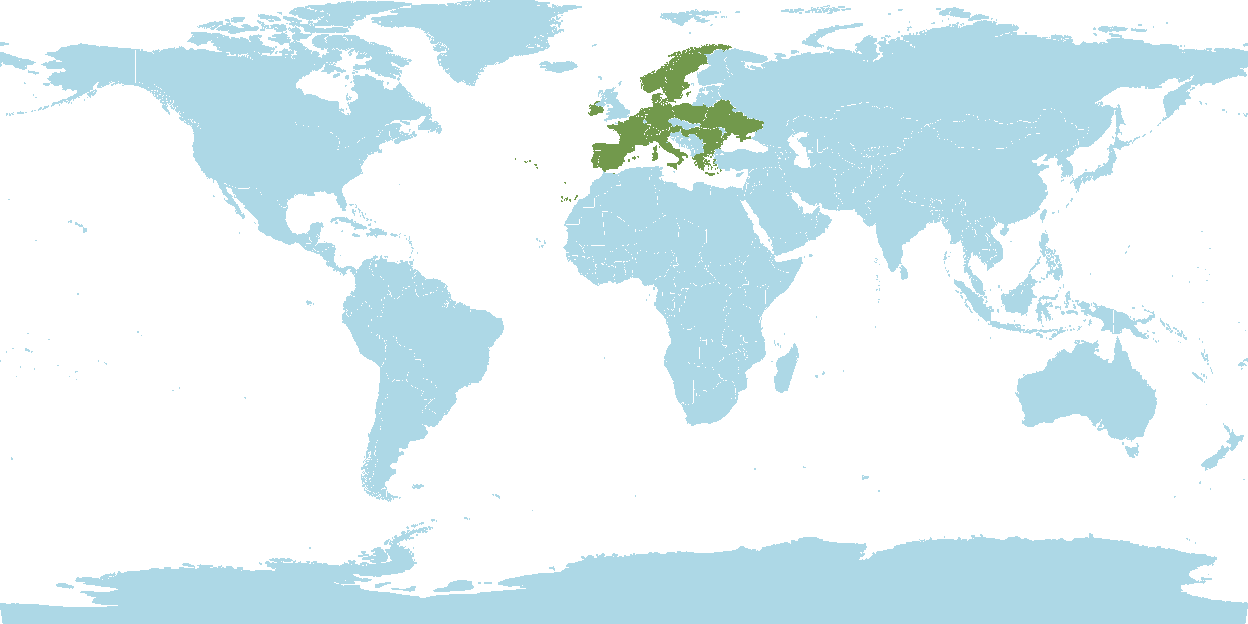 - World Distribution : Austria, Baltic States, Belarus, Belgium, Bulgaria, Central European Russia, Corse, Czechoslovakia, Denmark, France, Germany, Great Britain, Greece, Hungary, Ireland, Italy, Netherlands, Northwest European Russia, Norway, Poland, Portugal, Romania, Sardegna, Sicilia, Spain, Sweden, Switzerland, Ukraine, Yugoslavia