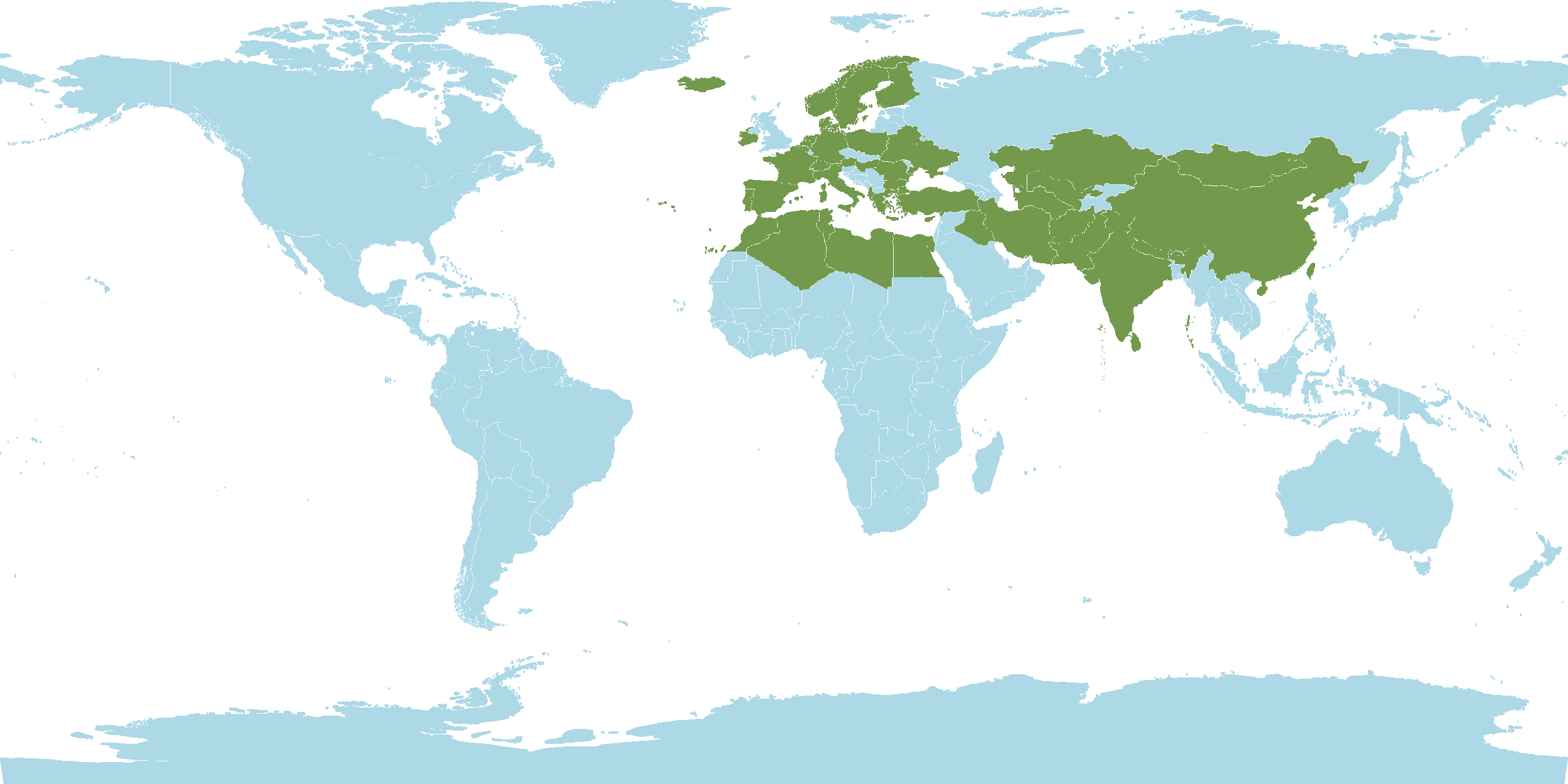 - World Distribution : Afghanistan, Albania, Algeria, Altay, Austria, Azores, Baleares, Baltic States, Belarus, Belgium, Bhutan, Bulgaria, Buryatiya, Canary Islands, Central European Rus, China, Corse, Cyprus, Czechoslovakia, Denmark, East Aegean Islands, East European Russia, Egypt, Finland, France, Føroyar, Germany, Great Britain, Greece, Hungary, Iceland, India, Inner Mongolia, Iran, Iraq, Ireland, Irkutsk, Italy, Kazakhstan, Kirgizstan, Krasnoyarsk, Kriti, Krym, Lebanon-Syria, Libya, Madeira, Mongolia, Morocco, Nepal, Netherlands, North Caucasus, North European Russi, Northwest European R, Norway, Pakistan, Palestine, Poland, Portugal, Romania, Sardegna, Sicilia, South European Russi, Spain, Sri Lanka, Sweden, Switzerland, Tadzhikistan, Taiwan, Tibet, Transcaucasus, Tunisia, Turkey, Turkey-in-Europe, Turkmenistan, Tuva, Ukraine, Uzbekistan, West Siberia, Xinjiang, Yugoslavia