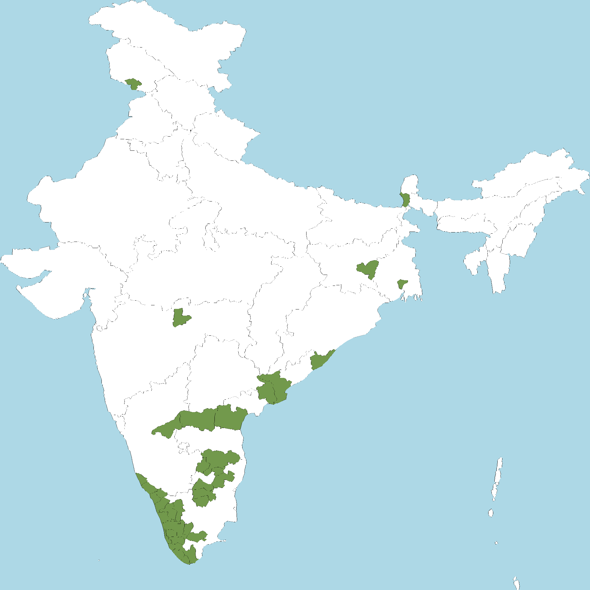 - Tamil Nadu : Coimbatore district,Dharmapuri district, The Nilgiri district, Kanyakumari district, Namakkal district, Salem district, Theni district, Tiruchirapalli district, Tirunelveli district, Tiruvannamalai district, Vellore district, Villipuram district, Virudhunagar district