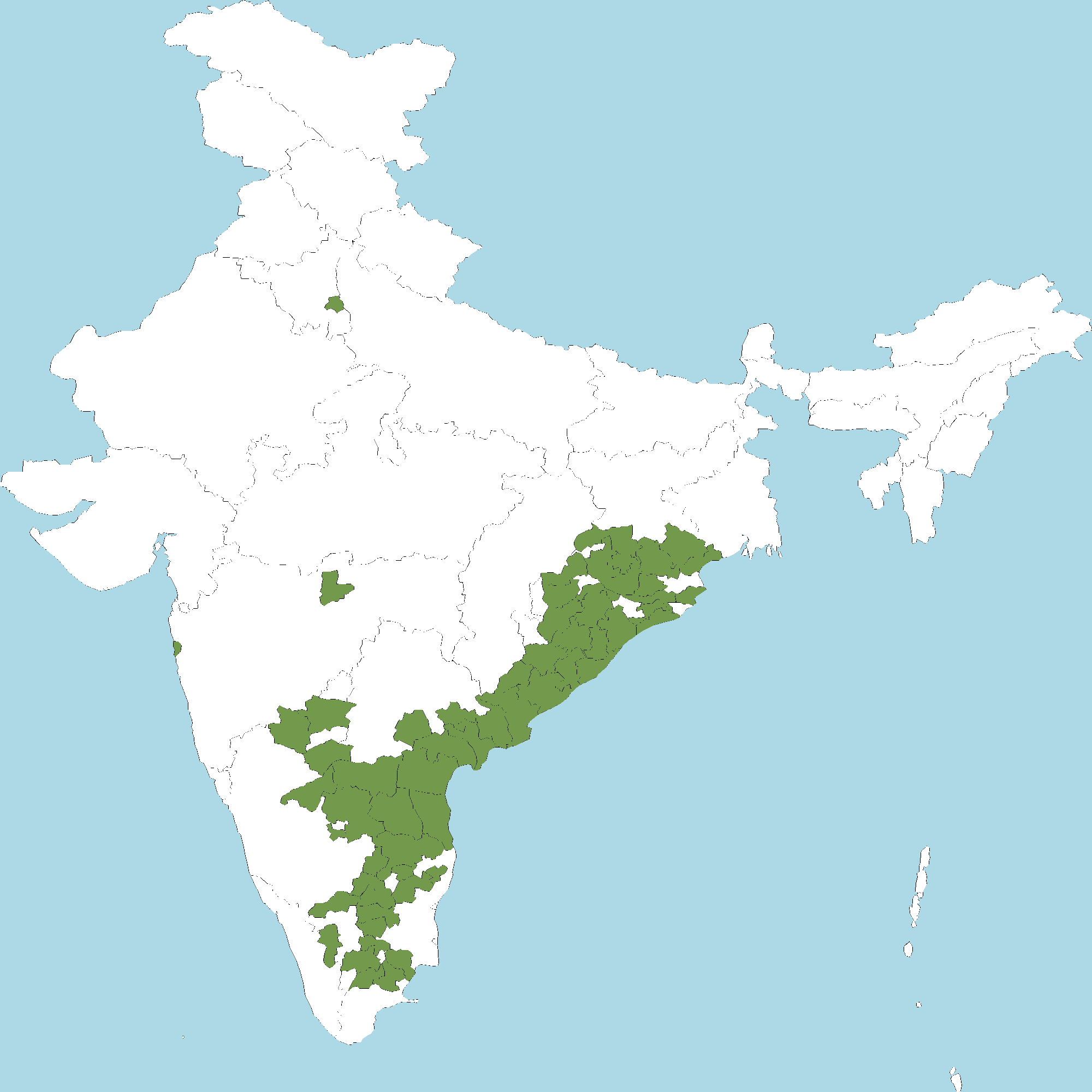- Andhra Pradesh : Anantapur district, Chittoor district, Y.S.R. Kadapa district, East Godavari district, Guntur district, Krishna district, Kurnool district, S.P.S. Nellore district, Prakasam district, Srikakulam district, Visakhapatnam district, Vizianagaram district, West Godavari district