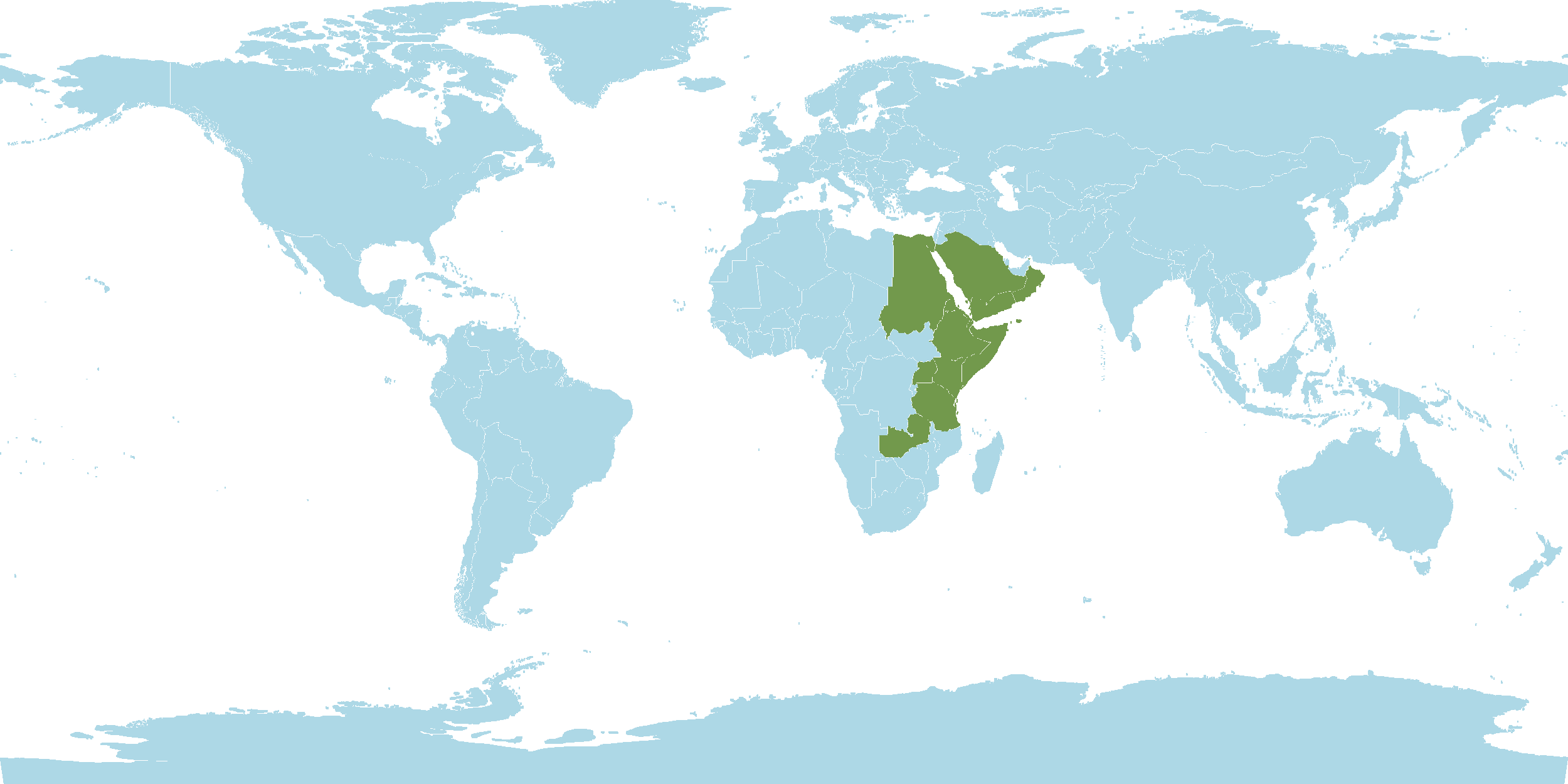 - World Distribution : Djibouti, Egypt, Eritrea, Ethiopia, Kenya, Oman, Saudi Arabia, Somalia, Sudan, Tanzania, Uganda, Yemen, Zambia, Zaïre