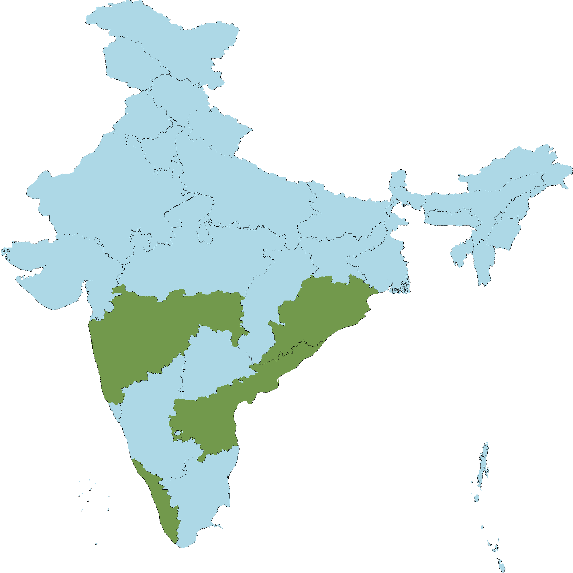• Kerala : Kasaragod district, Kannur district, Wayanad district, Kozhikode district, Malappuram district, Palakkad district, Thrissur district, Idukki district, Pathanamthitta district, Kollam district, Thiruvananthapuram district