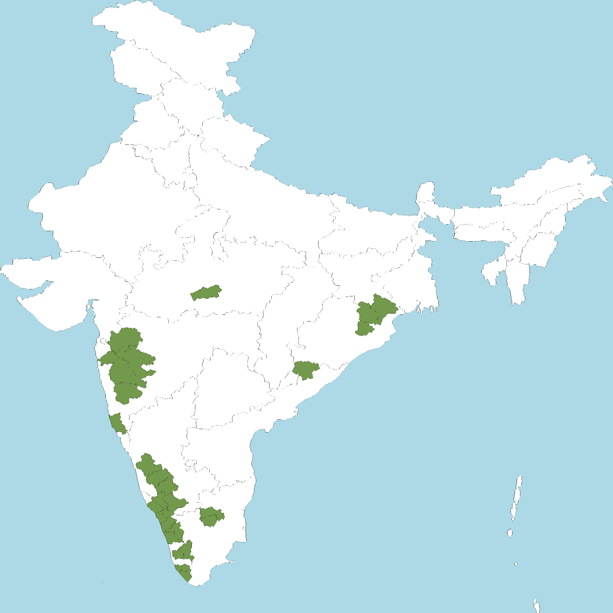 - Kerala : Kannur district, Wayanad district, Kozhikode district, Malappuram district, Palakkad district, Thrissur district, Idukki district, Kottayam district, Kollam district, Thiruvananthapuram district