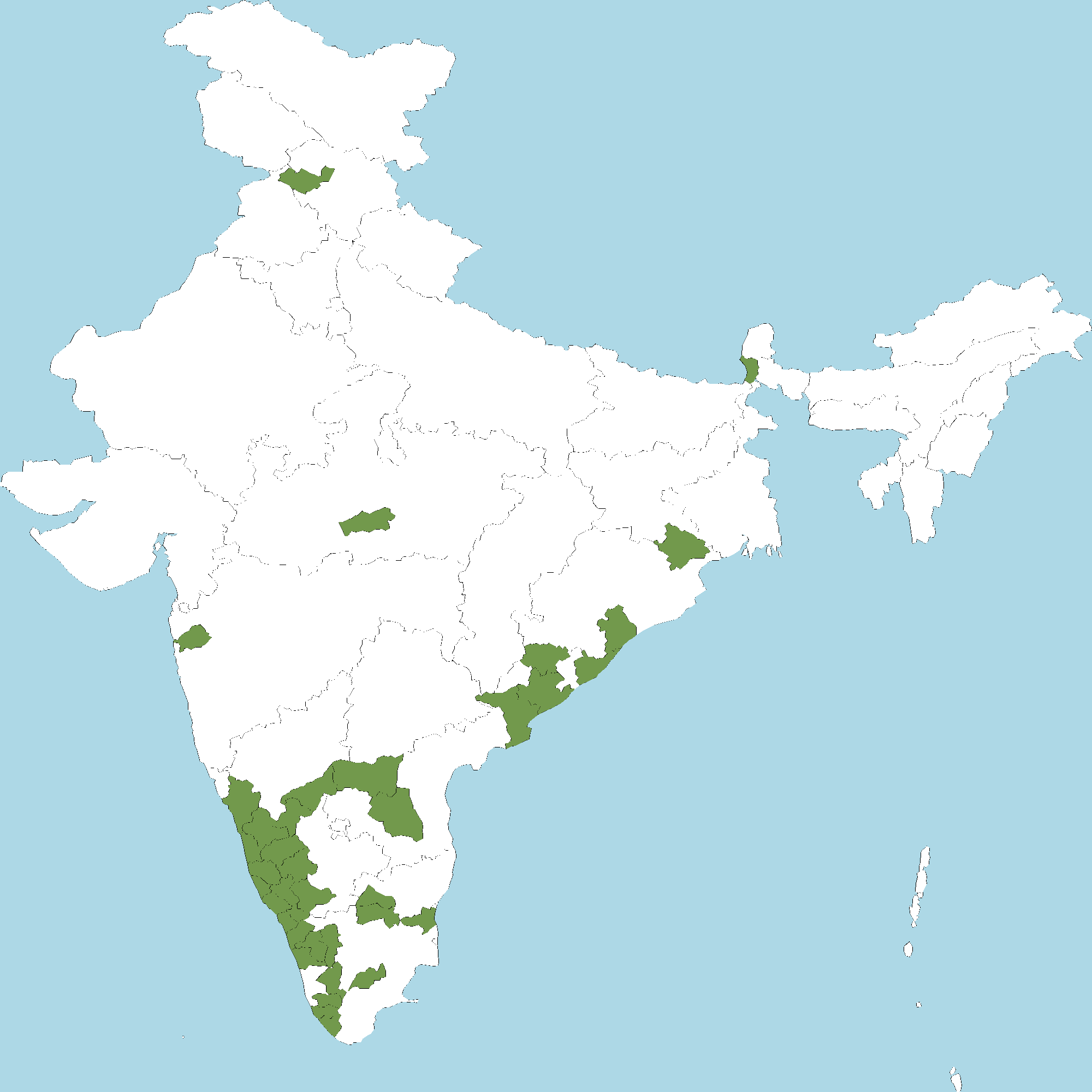 - Karnataka : Ballari district, Chikkamagaluru district, Dakshina Kannada district, Davanagere district, Hassan district, Kodagu (Coorg) district, Mysuru district, Shivamogga district, Udupi district, Uttara Kannada district