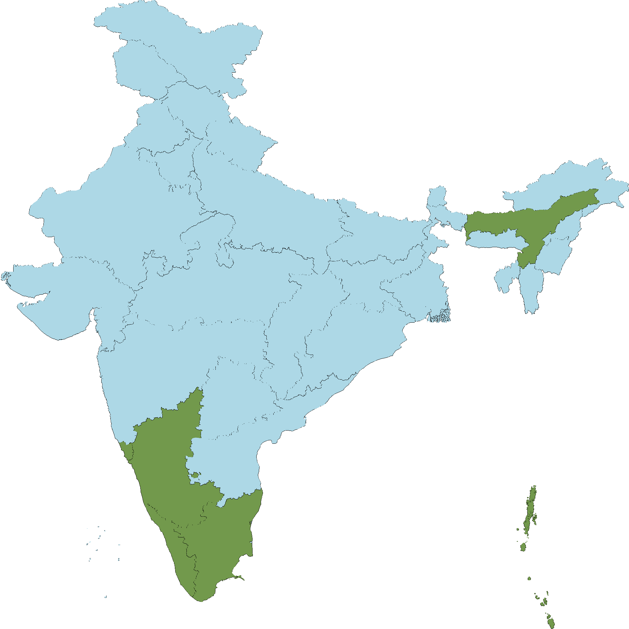 - Karnataka : Chikkamagaluru district, Hassan district, Kodagu (Coorg) district, Dakshina Kannada district, Shivamogga district, Uttara Kannada district