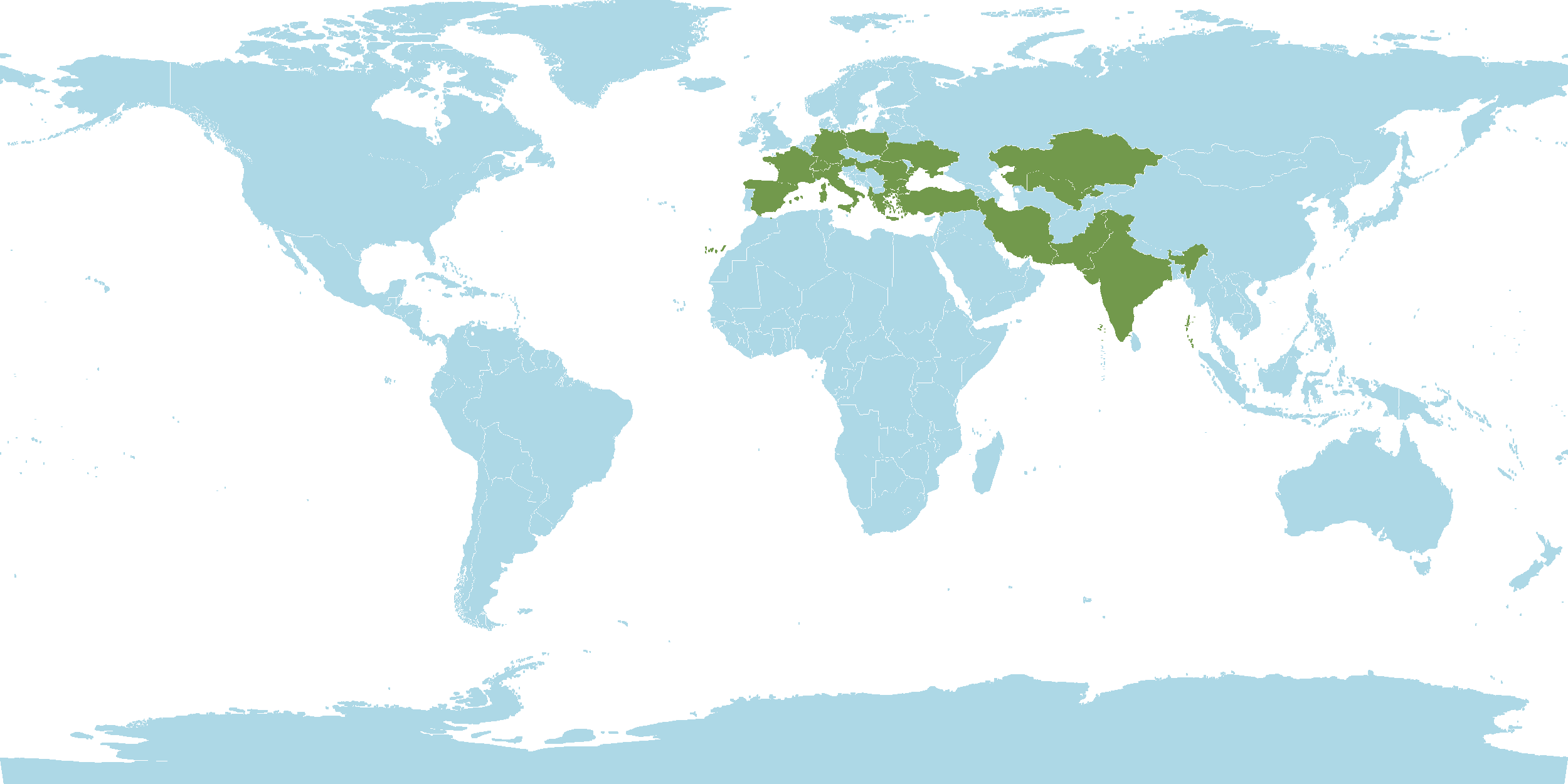 -  World Distribution : Albania, Altay, Austria, Bulgaria, Czechoslovakia, East European Russia, France, Germany, Greece, Hungary, India, Iran, Italy, Kazakhstan, Kirgizstan, Krym, Lebanon-Syria, North Caucasus, Pakistan, Palestine, Poland, Romania, Sinai, South European Russia, Spain, Switzerland, Tadzhikistan, Transcaucasus, Turkey, Ukraine, Uzbekistan, Yugoslavia