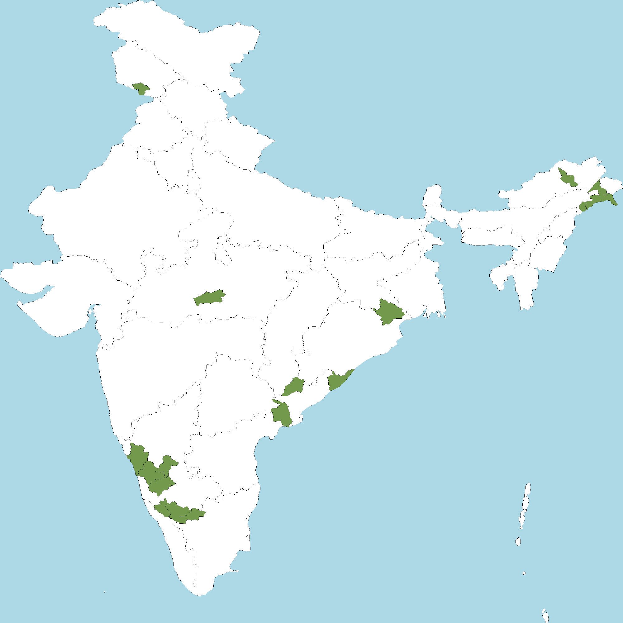 - Karnataka : Mysuru district, Davanagere district, Chamarajanagara district, Chikkamagaluru district, Kodagu (Coorg) district, Shivamogga district, Uttara Kannada district