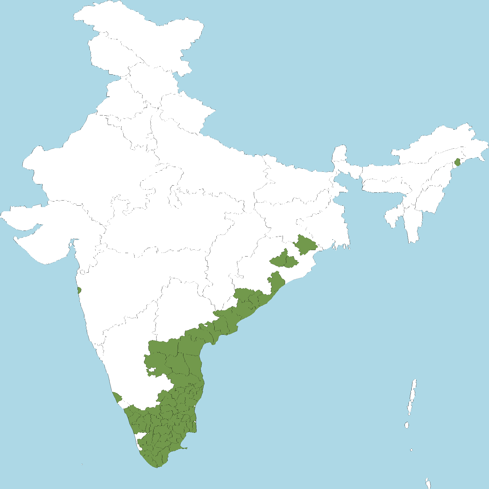 - Kerala : Kasaragod district, Wayanad district, Kozhikode district, Malappuram district, Palakkad district, Thrissur district, Idukki district, Kottayam district, Pathanamthitta district, Kollam district, Thiruvananthapuram district