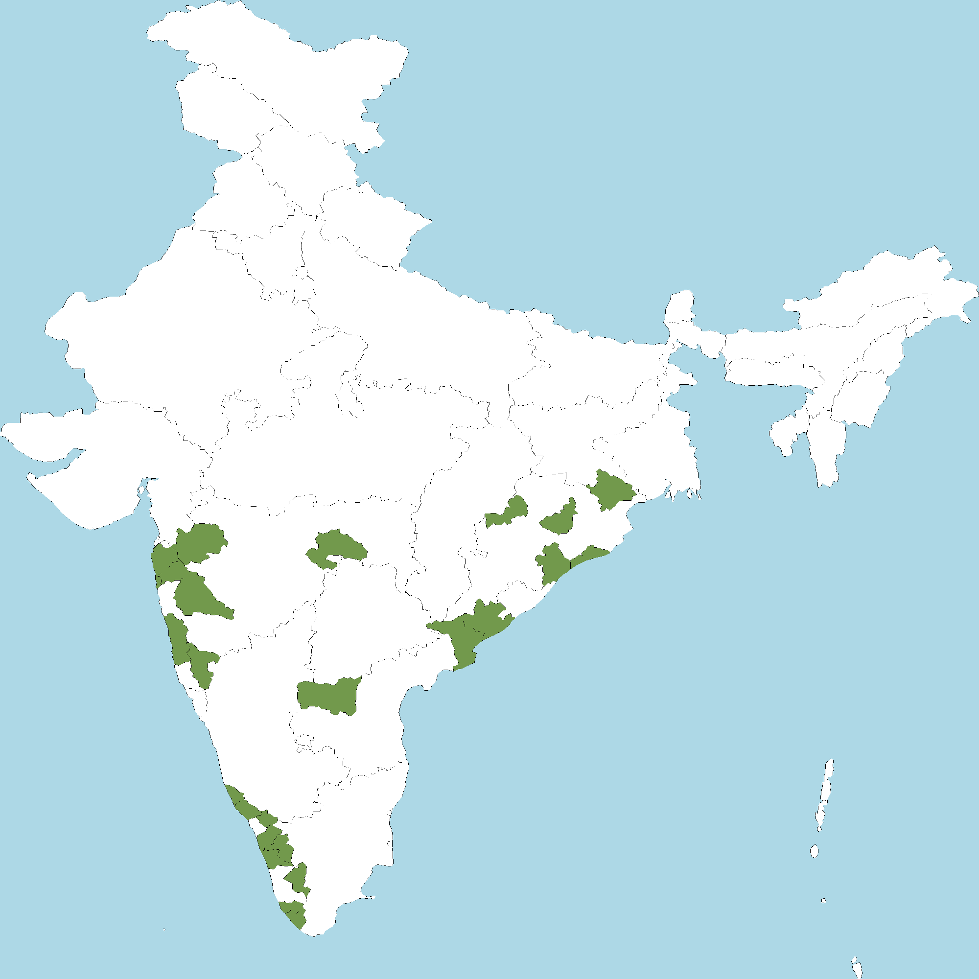 - Kerala : Kasaragod district, Kannur district, Wayanad district, Malappuram district, Palakkad district, Thrissur district, Idukki district, Kollam district, Thiruvananthapuram district