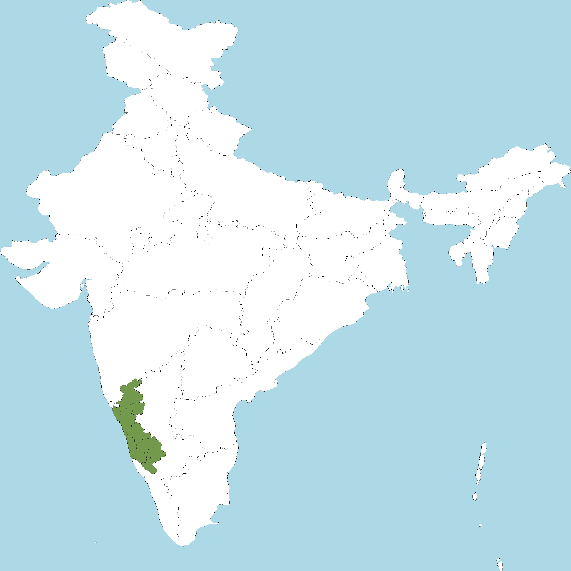 - Karnataka : Kodagu (Coorg) district, Dakshina Kannada district, Udupi district, Chikkamagaluru district, Shivamogga district, Belagavi district, Dharwad district, Hassan district,Uttara Kannada district