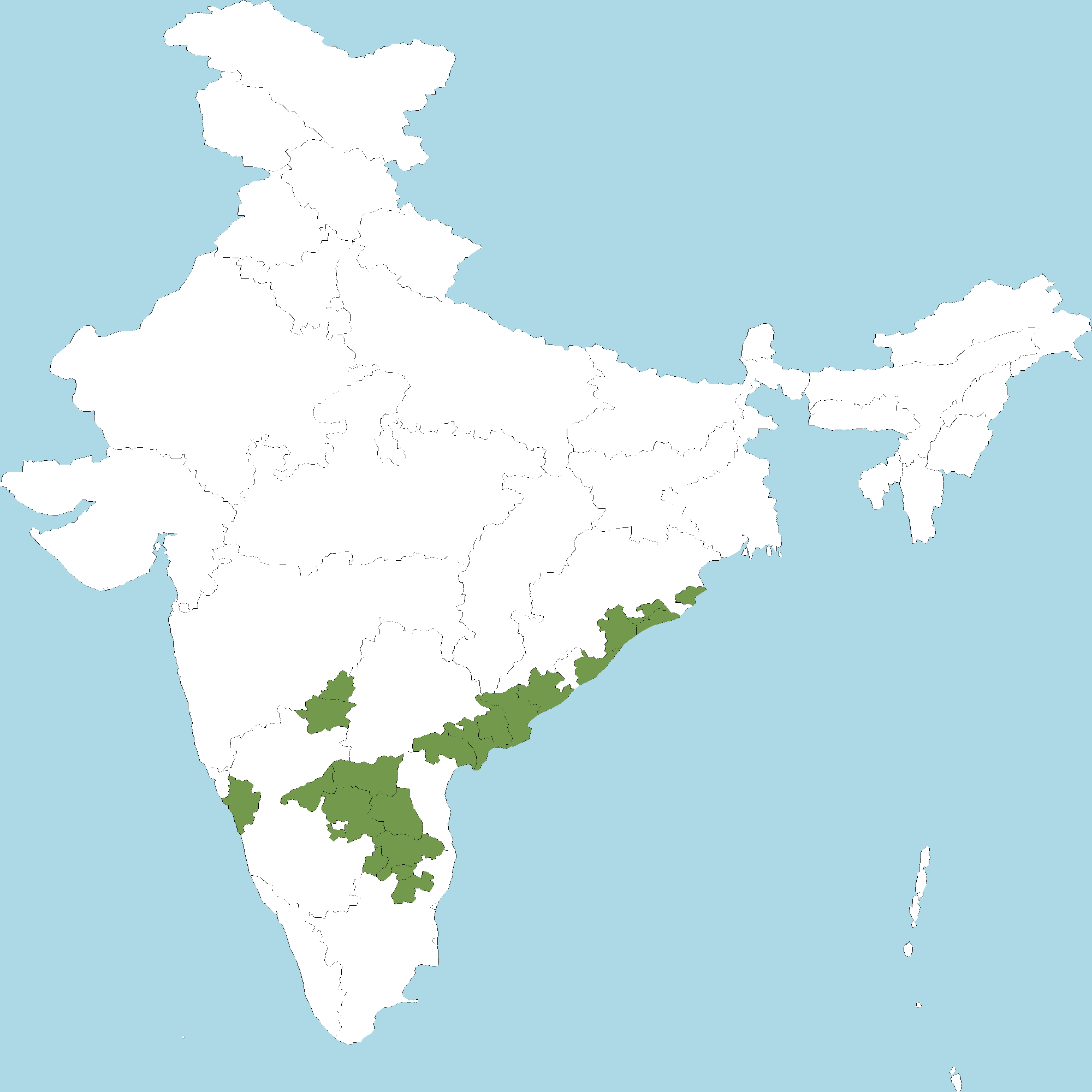 - Andhra Pradesh : Chittoor district, Kurnool district, Anantapur district, Y.S.R. Kadapa district, Guntur district, Krishna district, East Godavari district, West Godavari district, Visakhapatnam district, Srikakulam district