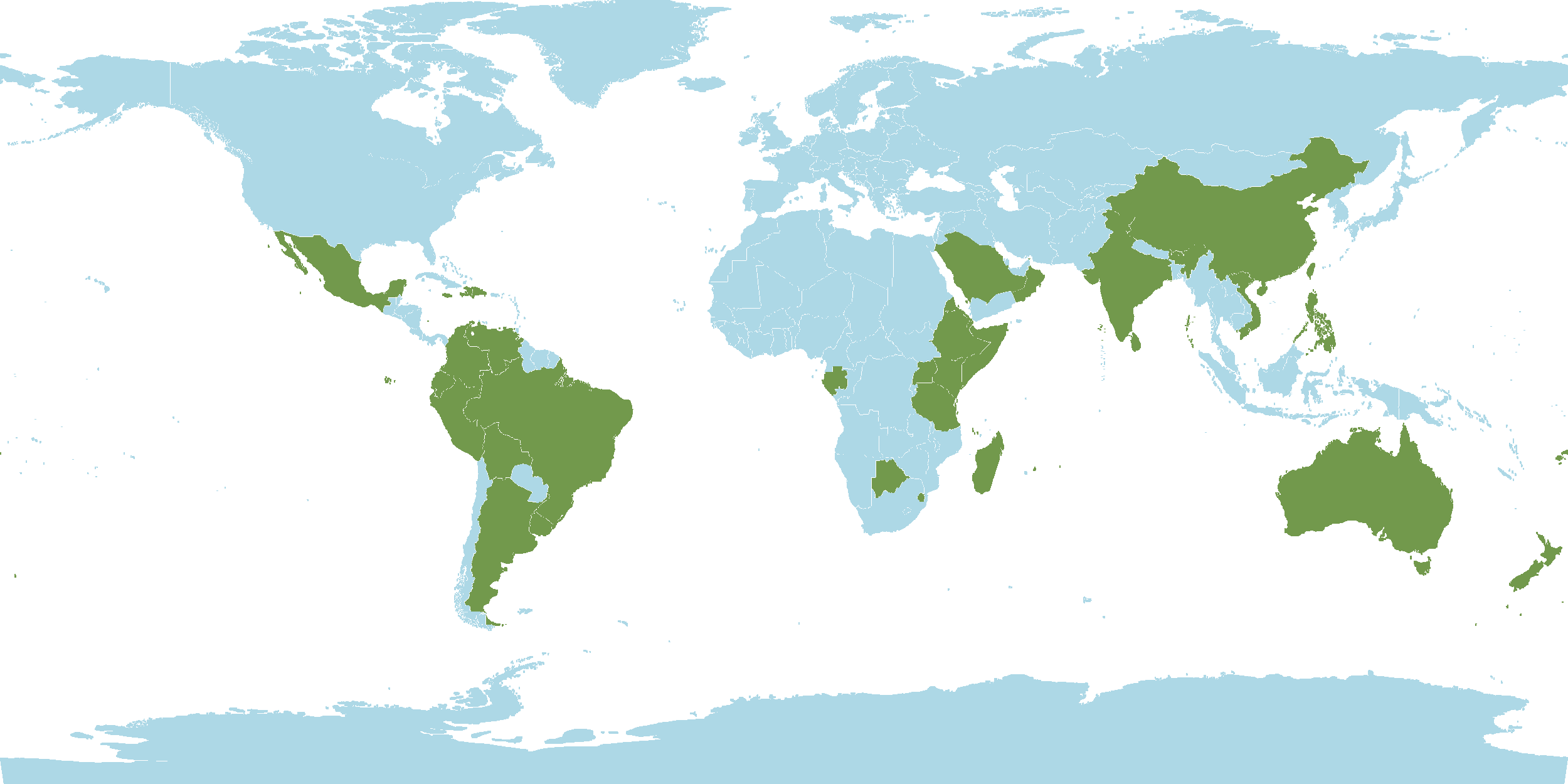 - Native : Argentina, Australia, Bermuda, Bismarck Archipelago, Bhutan, Bolivia, Botswana, Brazil, Cape Provinces, China, Colombia, Comoros, Djibouti, Dominican Republic, Ecuador, Eritrea, Ethiopia, Fiji, Florida, Gabon, Haiti, Hawaii, India, Jamaica, Jawa, Kenya, K