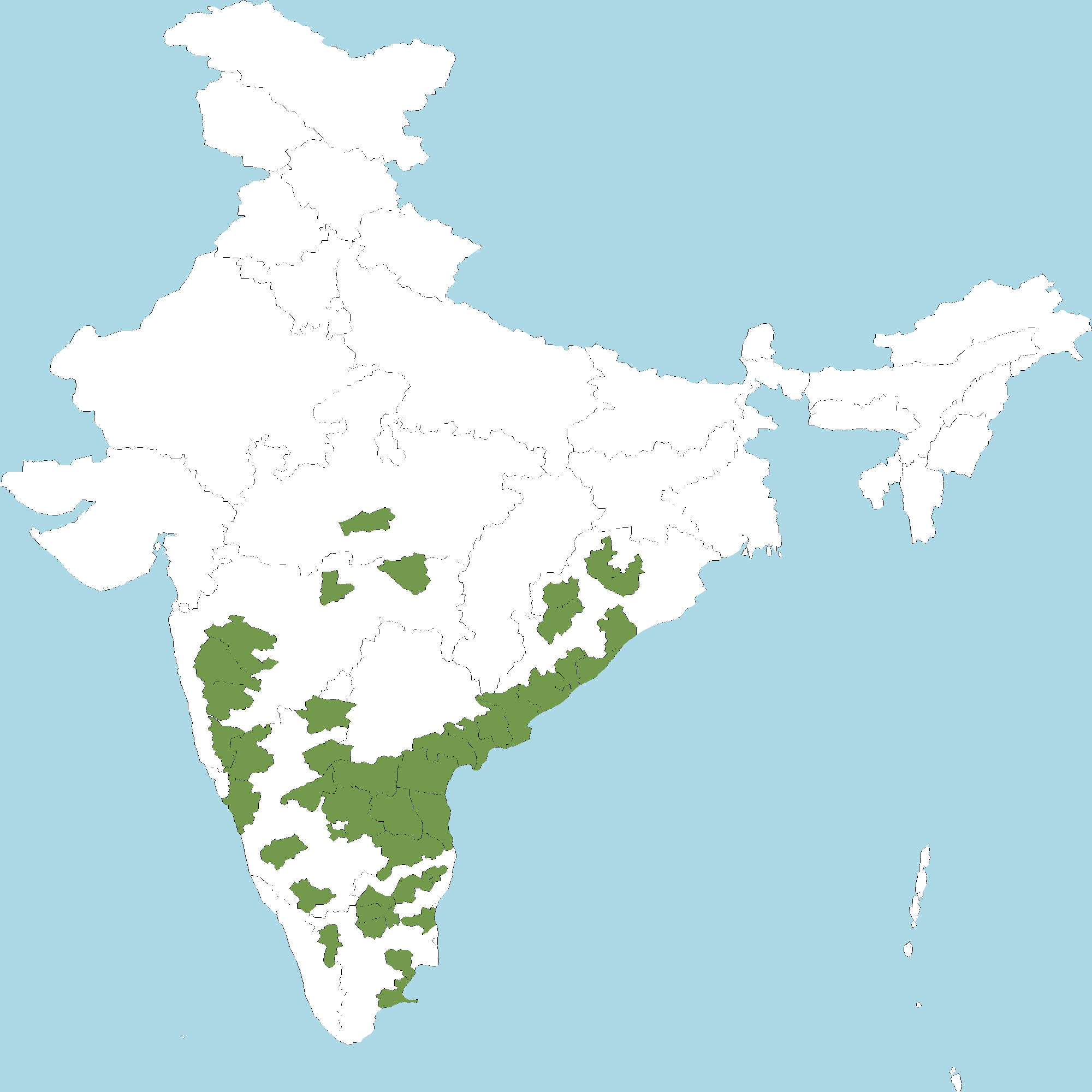 - Tamil Nadu : Changalpattu district, Coimbatore district, Cuddalore district, Dharmapuri district, Kancheepuram (Changalpattu-CGP) district, MADU, Namakkal district, Pudukkottai district, Ramanathapuram district, Salem district, Tiruchirapalli district, Tiruvannamalai district, Villipuram district