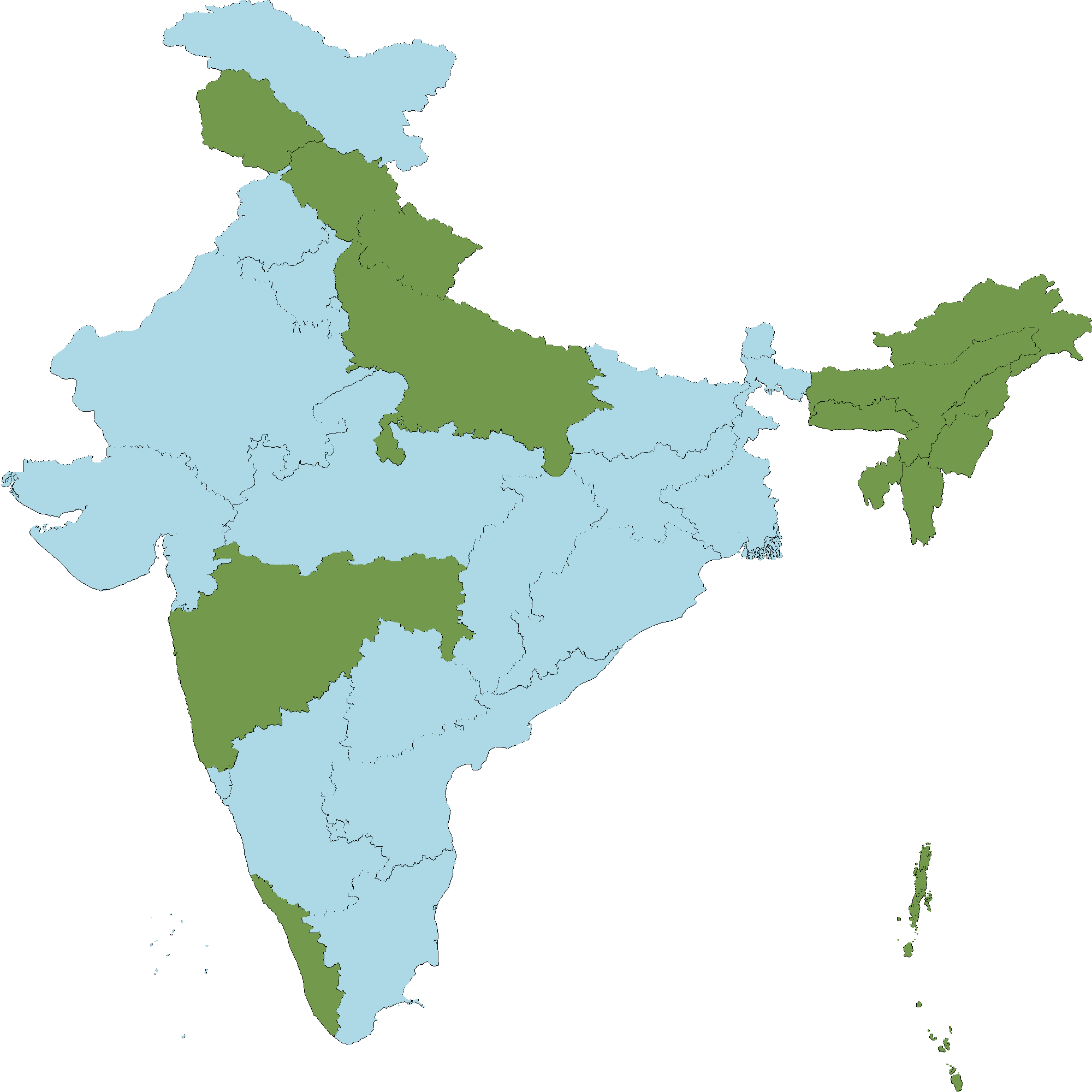 - Kerala : Kannur district, Wayanad district, Idukki district, Kottayam district, Alappuzha district, Pathanamthitta district, Kollam district