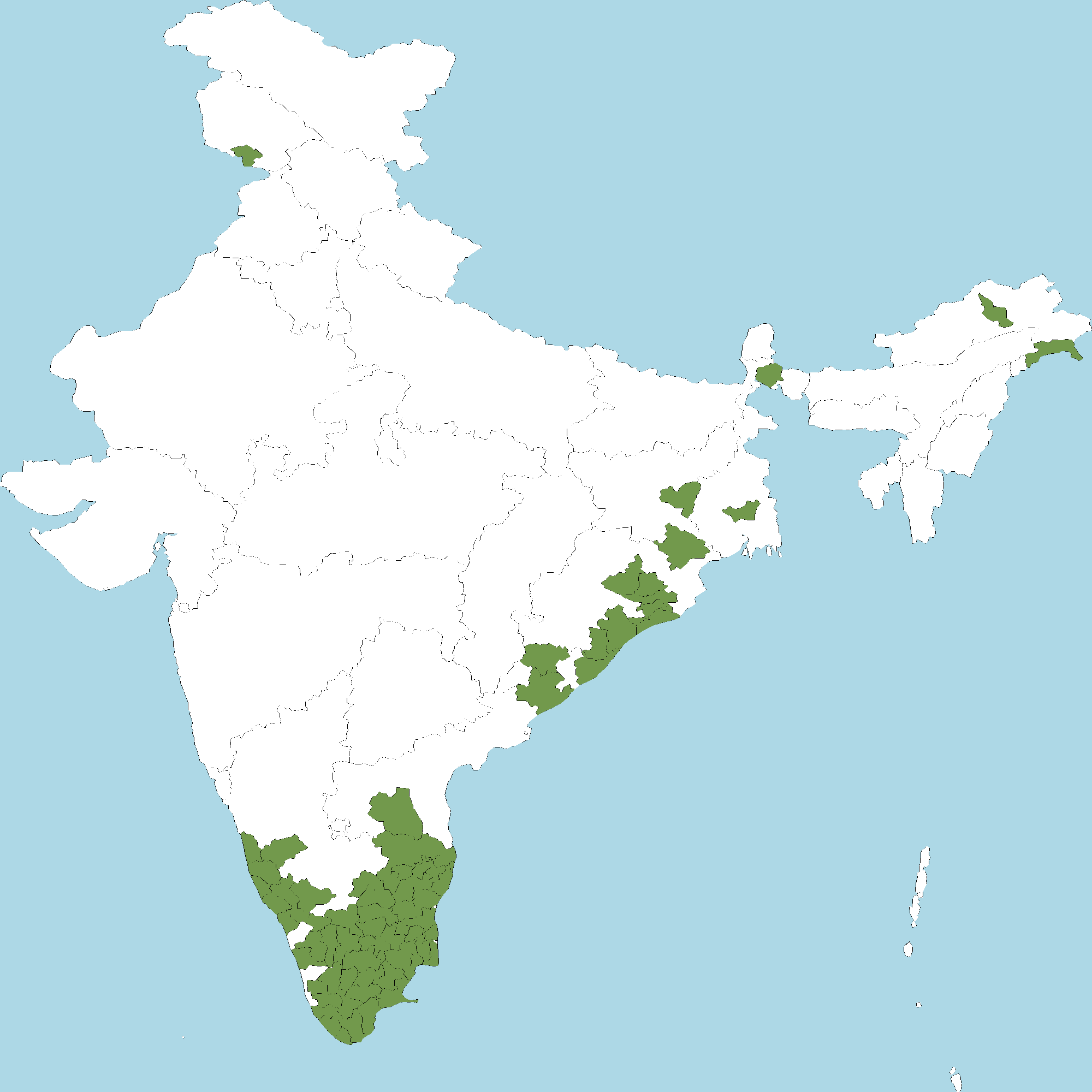 - Kerala : Kasaragod district, Kannur district, Wayanad district, Kozhikode district, Palakkad district, Thrissur district, Idukki district, Kottayam district, Pathanamthitta district, Kollam district, Thiruvananthapuram district
