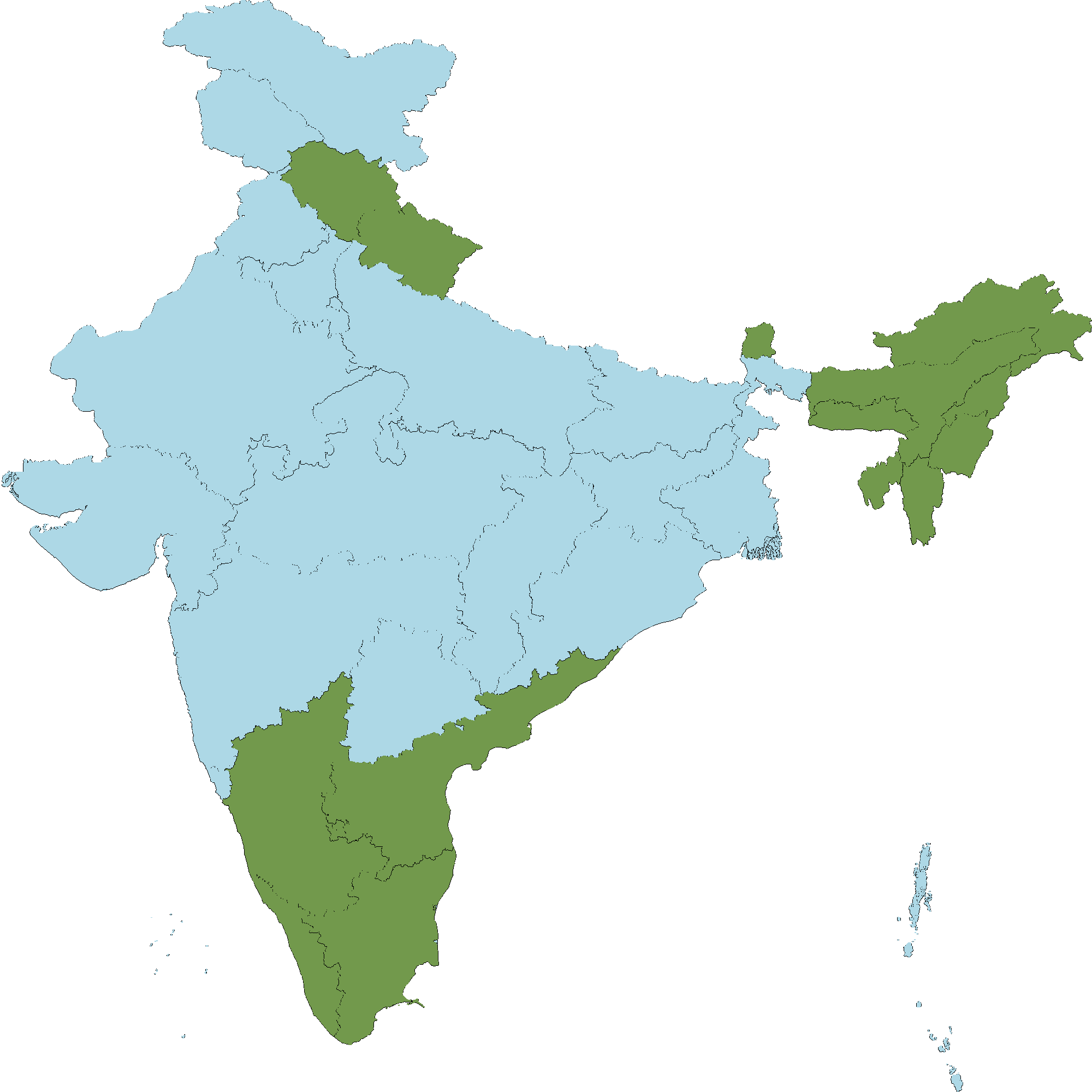 - Kerala : Kannur district, Wayanad district, Kozhikode district, Malappuram district, Palakkad district, Thrissur district, Idukki district, Kottayam district, Pathanamthitta district, Kollam district, Thiruvananthapuram district