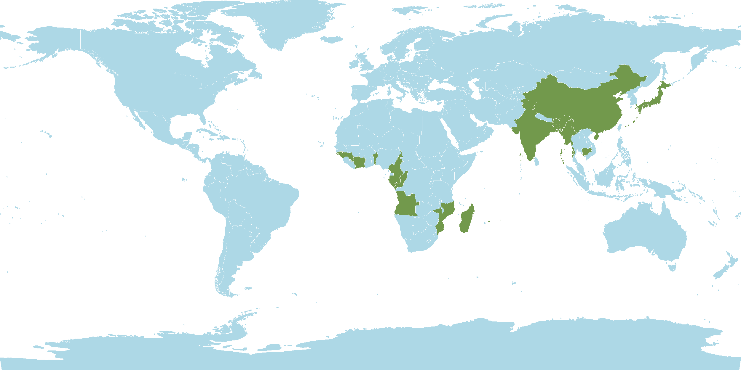 - Native : Angola, Bangladesh, Benin, Bhutan, Cambodia, Cameroon, China, Congo, Gabon, Guinea, Guinea-Bissau, Gulf of Guinea Islands, Hainan, India, Ivory Coast, Japan, Jawa, Lakshadweep Islands, Madagascar, Malaya, Mauritius, Mozambique, Myanmar, Nansei-shoto, Nepa