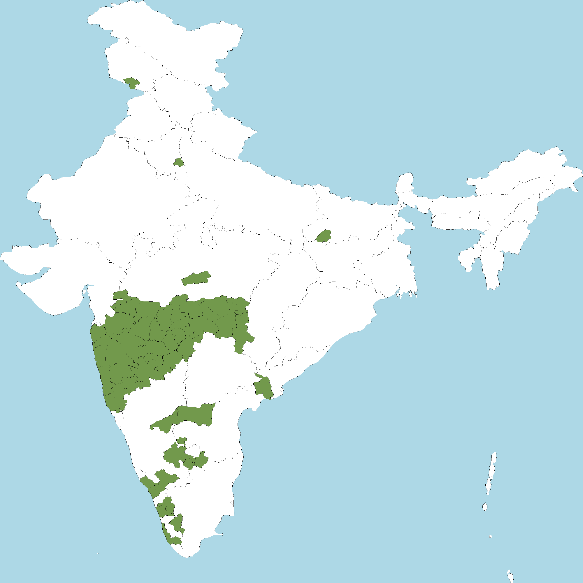 - Kerala : Kannur district, Wayanad district, Kozhikode district, Palakkad district, Thrissur district, Alappuzha district, Kollam district, Idukki district
