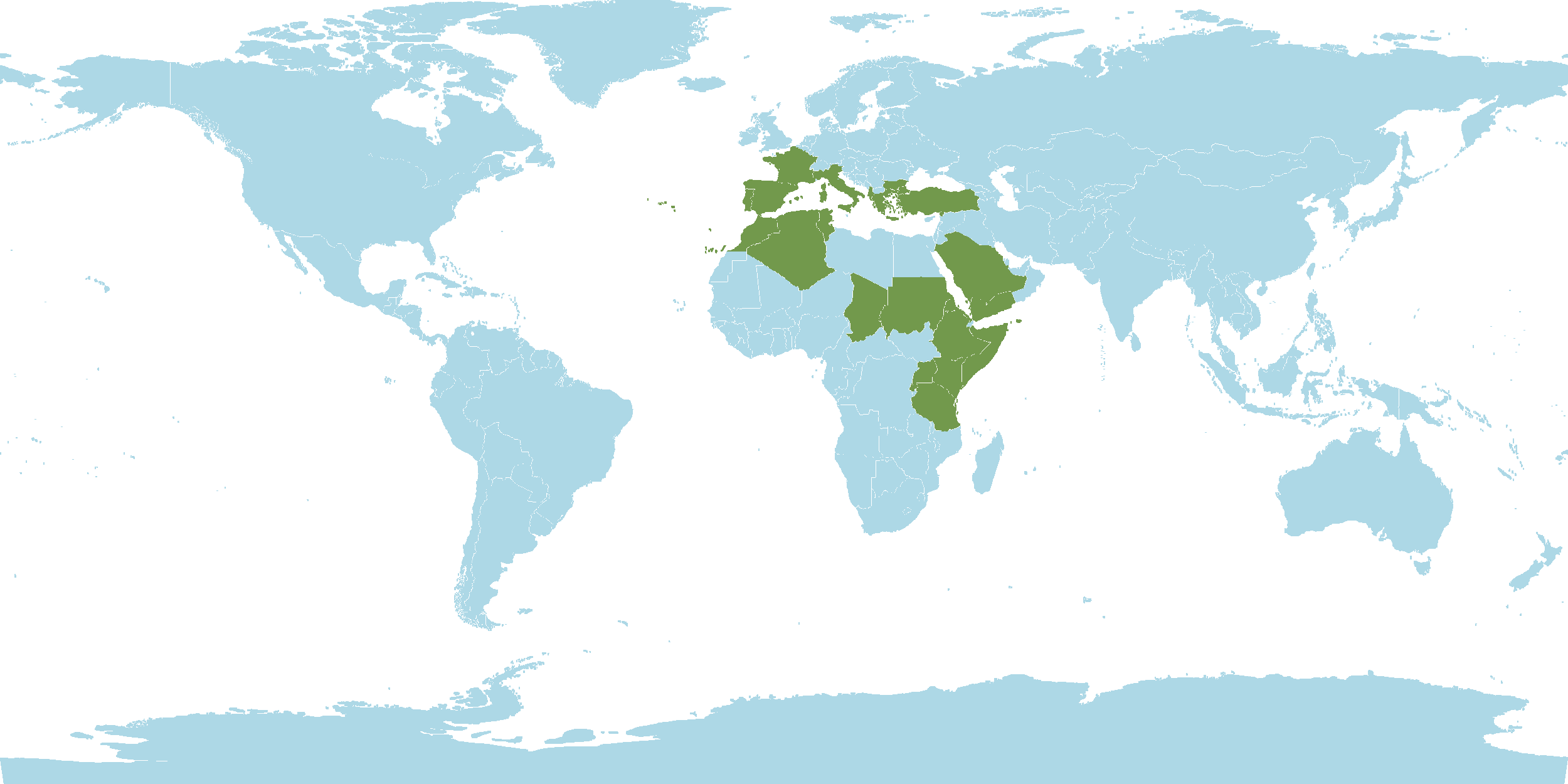 - Native : Albania, Algeria, Baleares, Bulgaria, Chad, Corse, East Aegean Islands, Eritrea, Ethiopia, France, Greece, Italy, Kenya, Kriti, Morocco, Portugal, Rwanda, Sardegna, Saudi Arabia, Sicilia, Somalia, Spain, Sudan, Tanzania, Transcaucasus, Tunisia, Turkey, Tu