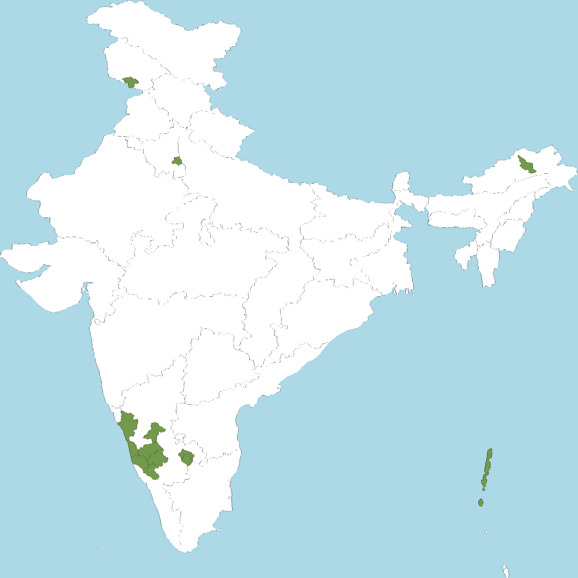 - Karnataka : Hassan district, Chikkamagaluru district, Bengaluru Urban district, Bengaluru Rural district, Kodagu (Coorg) district, Udupi district, Uttara Kannada district, Davanagere district, Dakshina Kannada district
