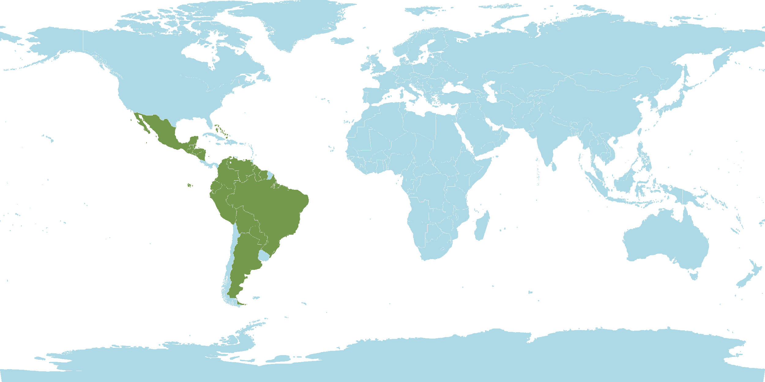- World Distribution : Argentina, Aruba, Bahamas, Belize, Bolivia, Brazil, Colombia, Ecuador, El Salvador, French Guiana, Guatemala, Guyana, Honduras, Leeward Islands, Mexico, Netherlands Antilles, Nicaragua, Paraguay, Peru, Suriname, Trinidad-Tobago, Venezuela, Venezuelan Antilles, Windward Islands