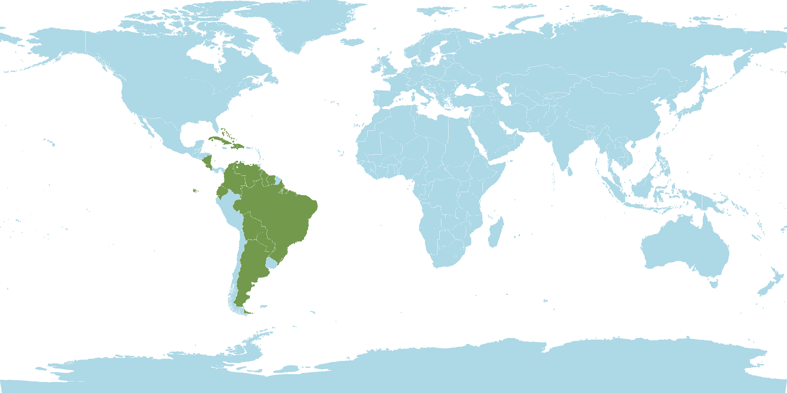 - World Distribution : Argentina, Bahamas, Bolivia, Brazil, Colombia, Costa Rica, Cuba, Dominican Republic, Ecuador, French Guiana, Guyana, Haiti, Leeward Islands, Nicaragua, Paraguay, Puerto Rico, Suriname, Trinidad-Tobago, Venezuela, Windward Islands