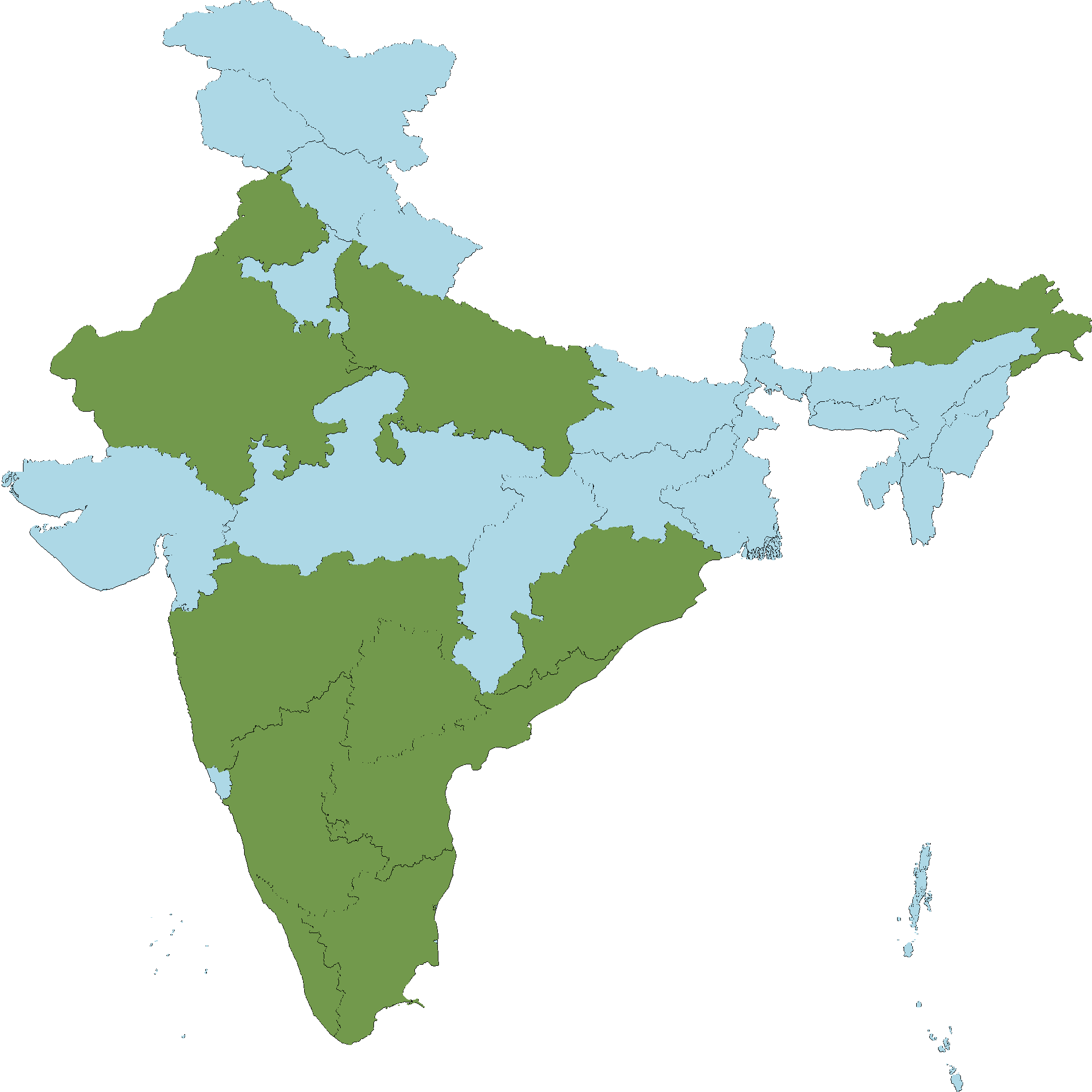 Andhra Pradesh : Anantapur district, Chittoor district, Kadapa district, East Godavari district, Guntur district, Krishna district, Kurnool district, Nellore district, Prakasam district, Srikakulam district, Vishakapatnam district, Vizianagaram district, West Godavari district  Telangana : Nalgonda district, Khammam district, Mehboobnagar district  Karnataka : All districts of Karnataka  Kerala : Kannur district, Wayanad district, Palakkad district, Idukki district, Kottayam district, Alappuzha district  Maharashtra : Akola district  Odisha : Angul district, Balasore district, Bargarh district, Bolangir district, Boudh district, Cuttack district, Deogarh district, Dhenkanal district, Gajapati district, Ganjam district, Kalhandi district, Kandhamal district, Kendrapara district, Keonjhar district, Khurda district, Koraput district, Malkangiri district, Mayurbhanj district, Puri district, Rayagada district, Sambalpur district, Sundergarh district  Tamil Nadu : Coimbatore district, Dindigul district, Dharmapuri district, Kanchipuram (Changalpattu-CGP) district, Karur district, Krishnagiri district, Madurai district, Namakkal district, Pudukkottai district, Sivaganga district, Salem district, Tiruchirapalli district, Tiruvannamalai district, Villipuram district, Vellore district  Arunachal Pradesh : Kameng  Delhi : Delhi  Uttar Pradesh : Uttar Pradesh  Punjab : Punjab  Rajasthan : Alwar district