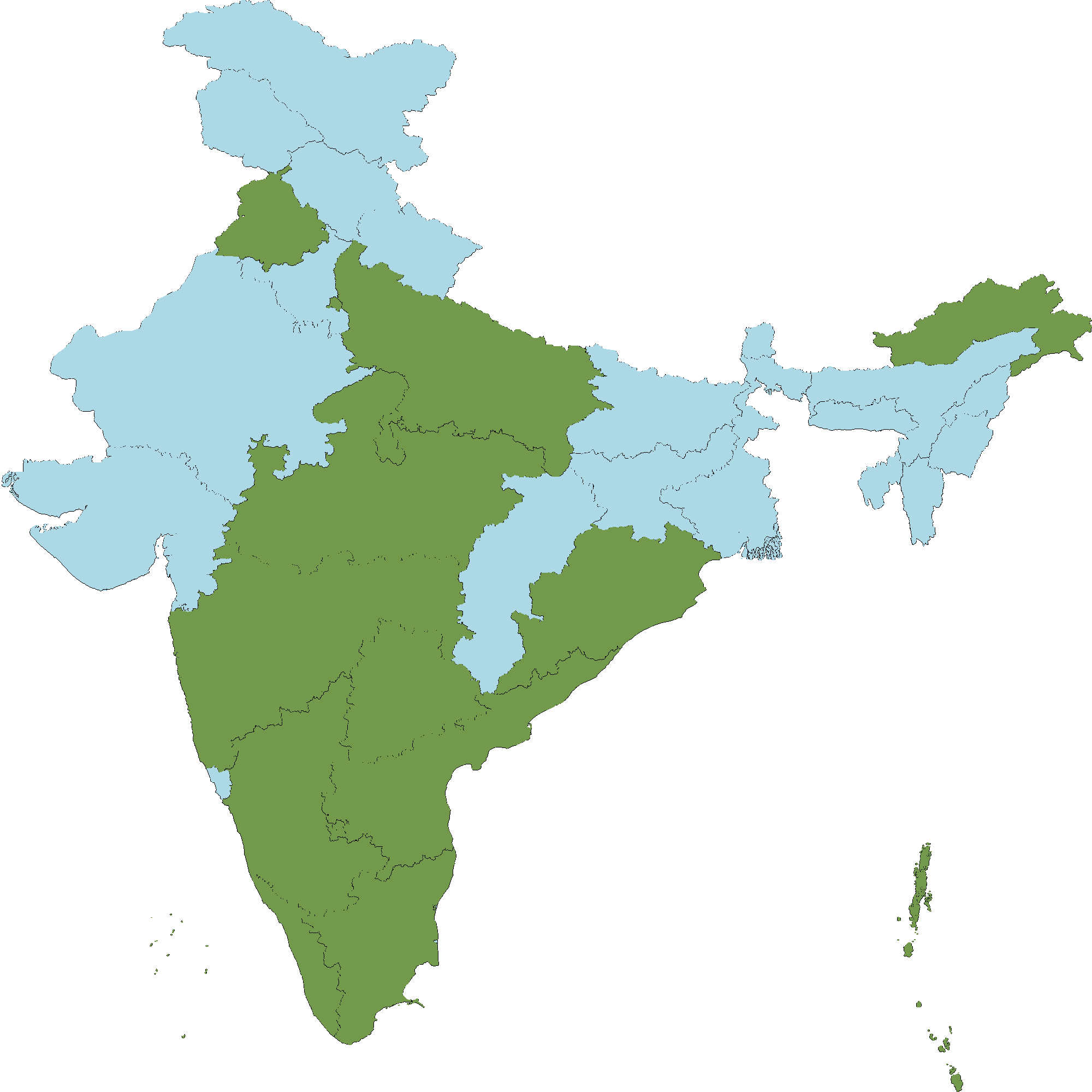 Andhra Pradesh : Anantapur district, Chittoor district, Kadapa district, East Godavari district, Guntur district, Krishna district, Kurnool district, Nellore district, Prakasam district, Srikakulam district, Vishakapatnam district, Vizianagaram district, West Godavari district  Telangana : Nalgonda district, Khammam district, Mehboobnagar district  Karnataka : All districts of Karnataka  Kerala : All districts of Kerala  Maharashtra : Akola district, Prabalmachi  Odisha : Angul district, Balasore district, Bargarh district, Bolangir district, Boudh district, Cuttack district, Deogarh district, Dhenkanal district, Gajapati district, Ganjam district, Kalhandi district, Kandhamal district, Kendrapara district, Keonjhar district, Khurda district, Koraput district, Malkangiri district, Mayurbhanj district, Puri district, Rayagada district, Sambalpur district, Sundergarh district  Tamil Nadu : Coimbatore district, Dindigul district, Dharmapuri district, Kanchipuram (Changalpattu-CGP) district, Karur district, Krishnagiri district, Madurai district, Namakkal district, Pudukkottai district, Sivaganga district, Salem district, Tiruchirapalli district, Tiruvannamalai district, Villipuram district, Vellore district  Madhya Pradesh : Hoshangabad district  Arunachal Pradesh : Changlang, Kameng, Lohit, Subansiri, Tirap  Delhi : Delhi  Uttar Pradesh : Uttar Pradesh  Punjab : Punjab  Andaman and Nicobar Islands : Andaman Islands  Lakshadweep : Kalpeni Islands, Thinnakara Islands