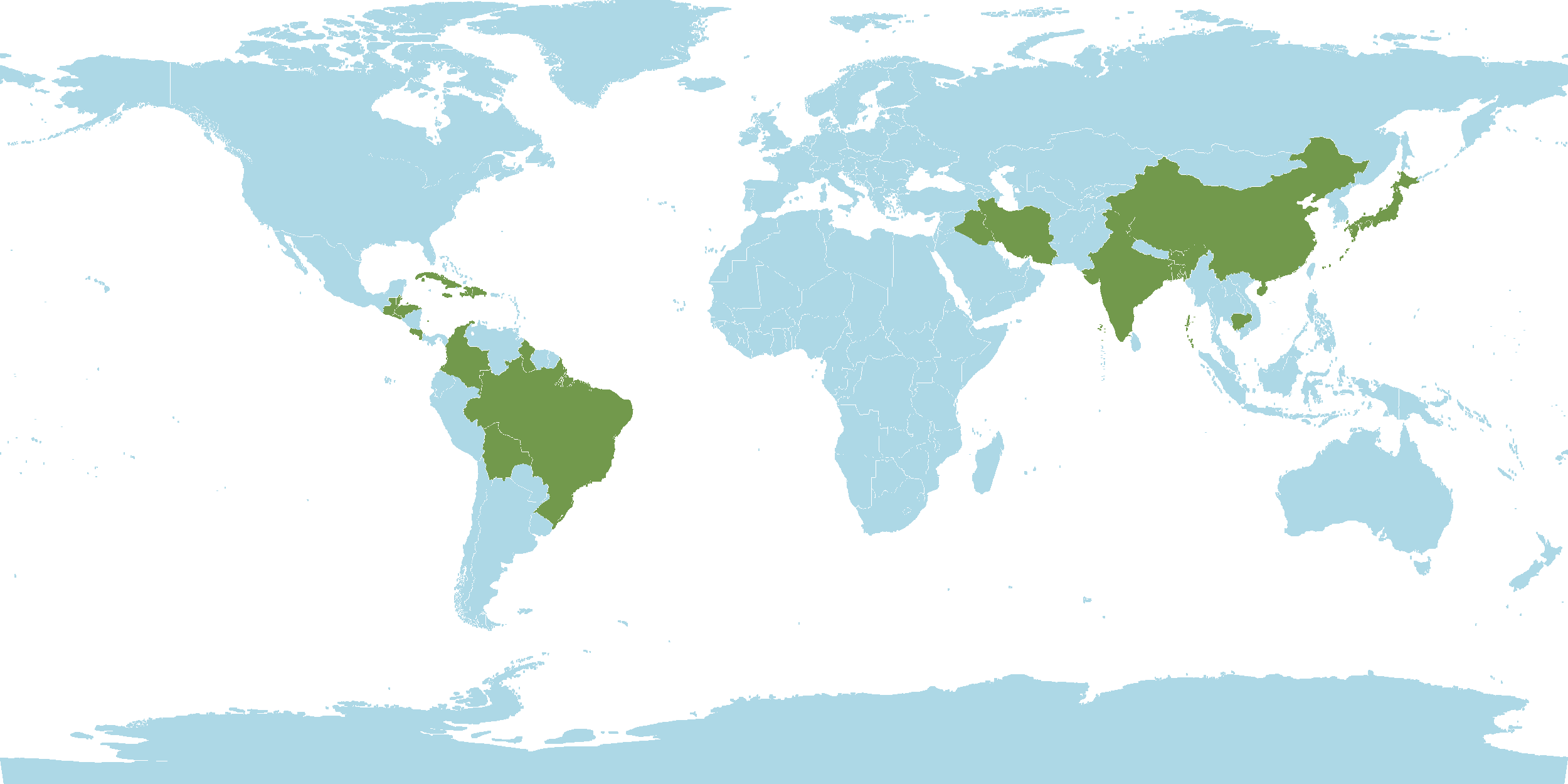 Native : Andaman Islands, Bangladesh, Belize, Bolivia, Borneo, Brazil, Cambodia, Cayman Islands, China, Colombia, Costa Rica, Cuba, Dominican Republic, Bhutan, El Salvador, French Guiana, Guatemala, Guyana, Haiti, Honduras, India, Iran, Iraq, Jamaica, Japan, Jawa,  Exotic/Native : Native  World Distribution : Tropics & sub-tropics of the World  Conservation Status : Least Concern (LC)  Literature :