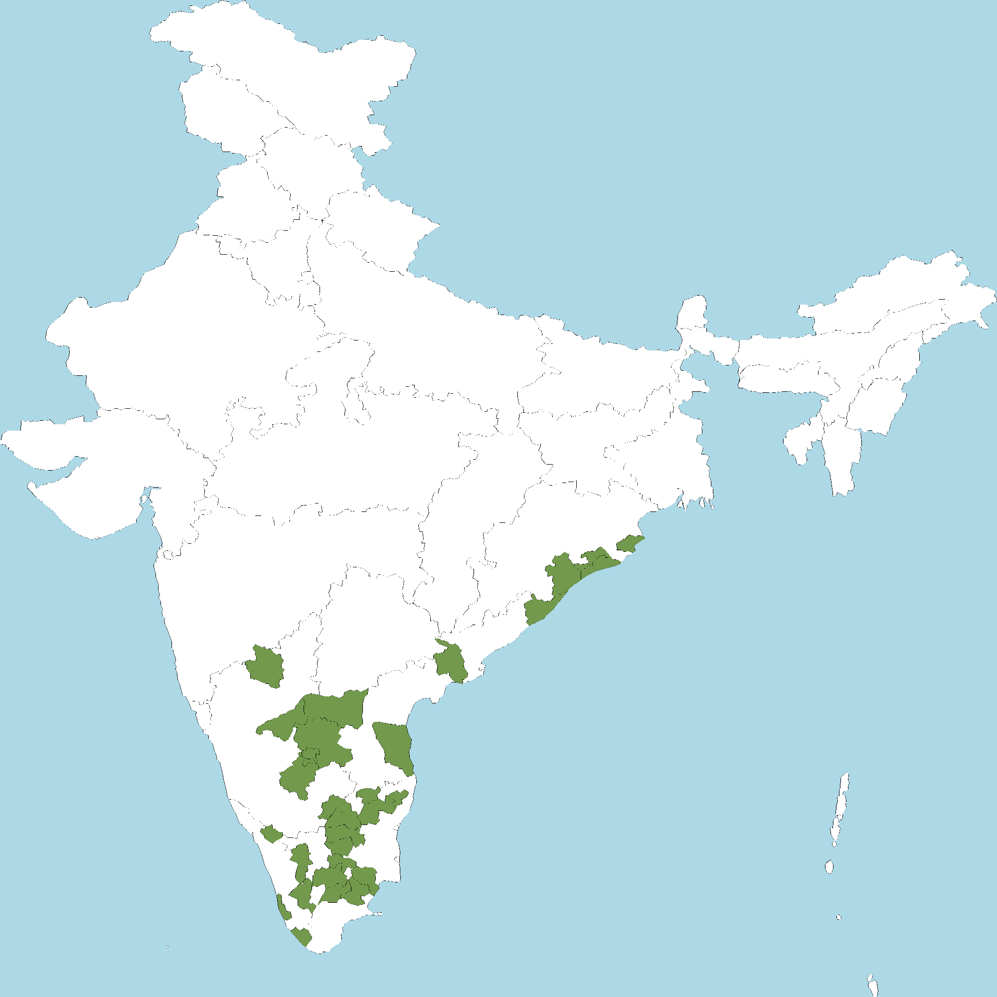 - Tamil Nadu : Coimbatore district, Dindigul district, Dharmapuri district, Kancheepuram (Changalpattu-CGP) district, Karur district, Krishnagiri district, Madurai district, Namakkal district, Pudukkottai district, Sivaganga district, Salem district, Tiruchirapalli district, Tiruvannamalai district, Villipuram district, Vellore district