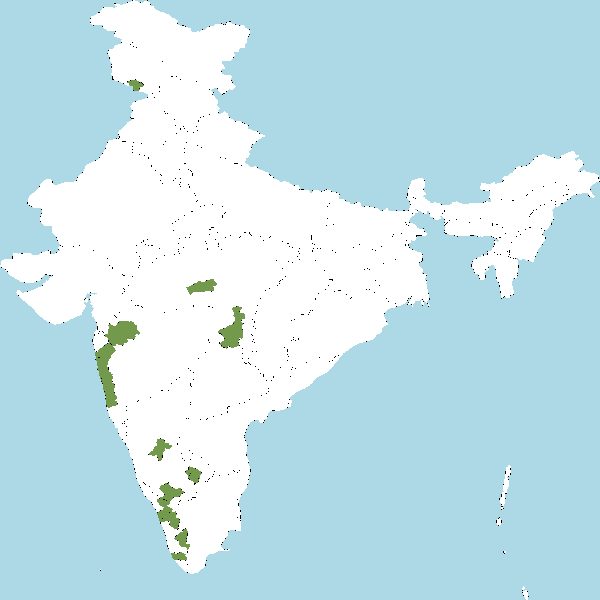 - Kerala : Wayanad district, Malappuram district, Palakkad district, Idukki district, Kollam district