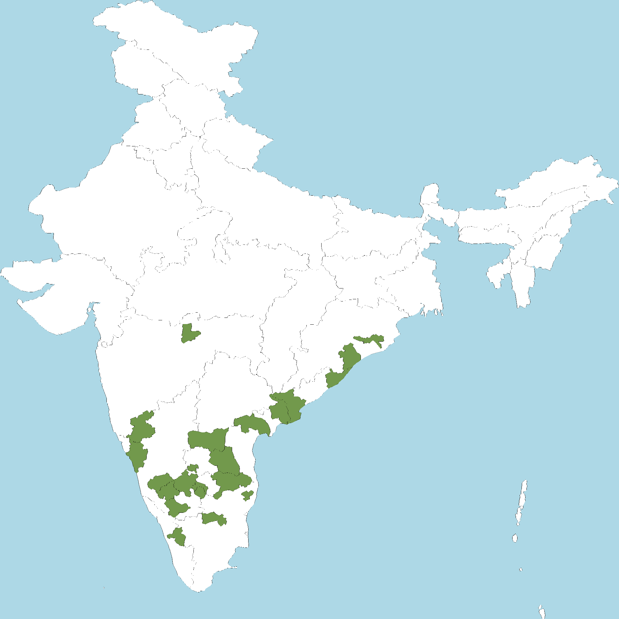 - Andhra Pradesh : Guntur district, Y.S.R. Kadapa district, East Godavari district, Kurnool district, Chittoor district, Srikakulam district, West Godavari district