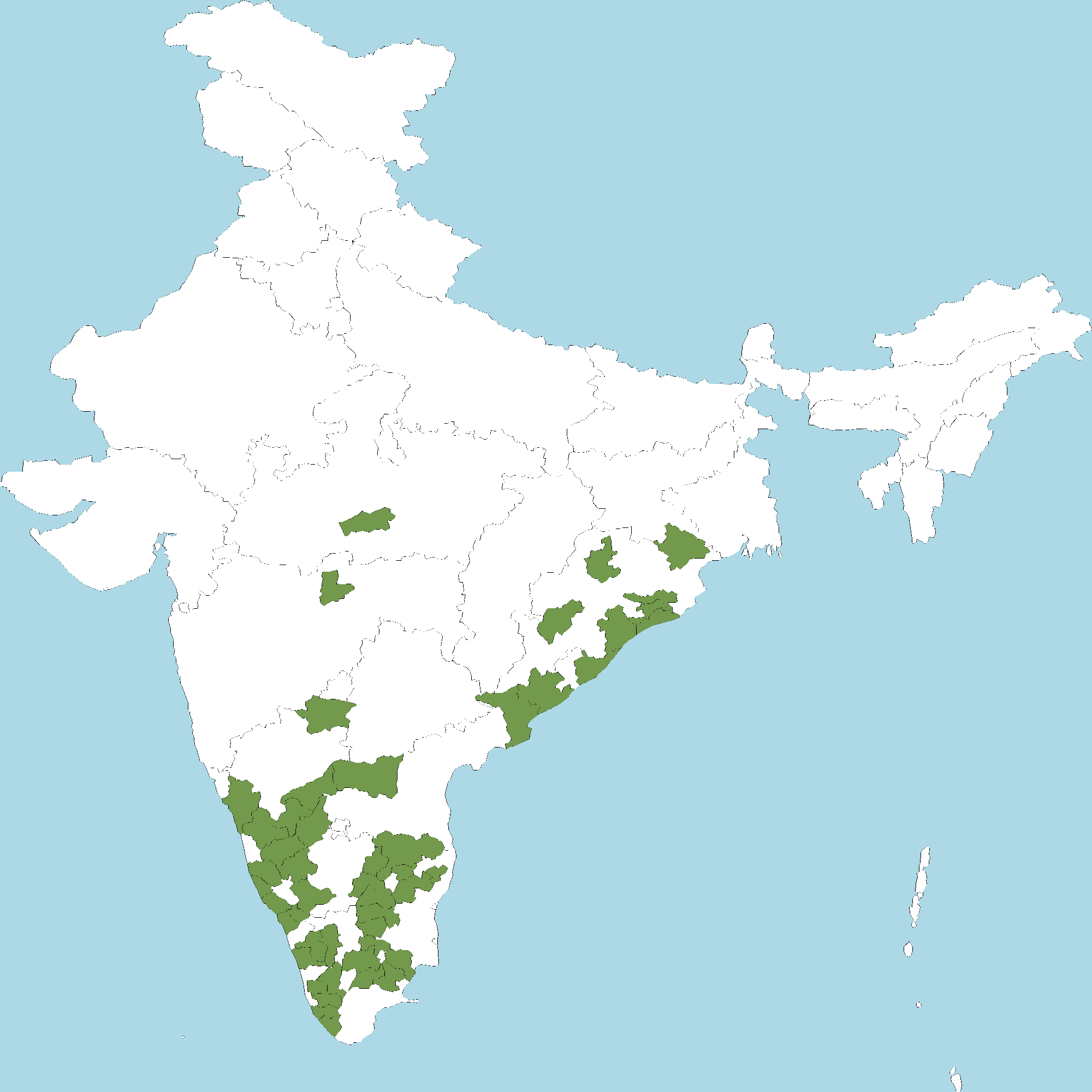 - Kerala : Kasaragod district, Kannur district, Wayanad district, Kozhikode district, Palakkad district, Thrissur district, Idukki district, Kottayam district, Pathanamthitta district, Kollam district, Thiruvananthapuram district