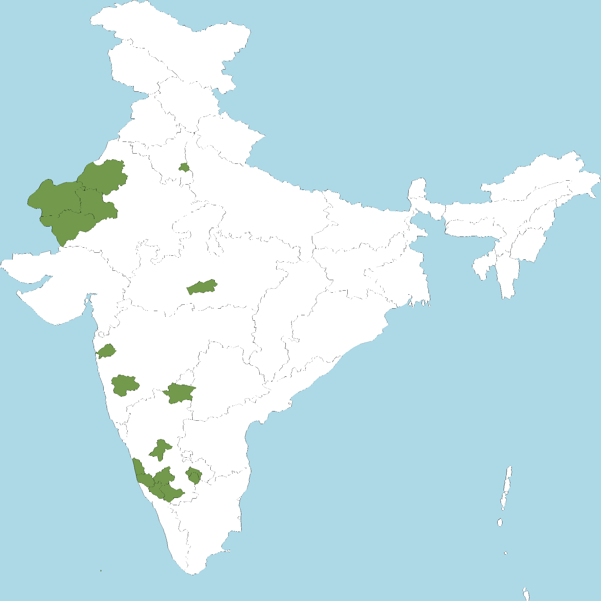 - Karnataka : Hassan district, Bengaluru Urban district, Bengaluru Rural district, Kodagu (Coorg) district, Udupi district, Davanagere district, Dakshina Kannada district, Kalaburagi (Gulbarga) district, Mysuru district