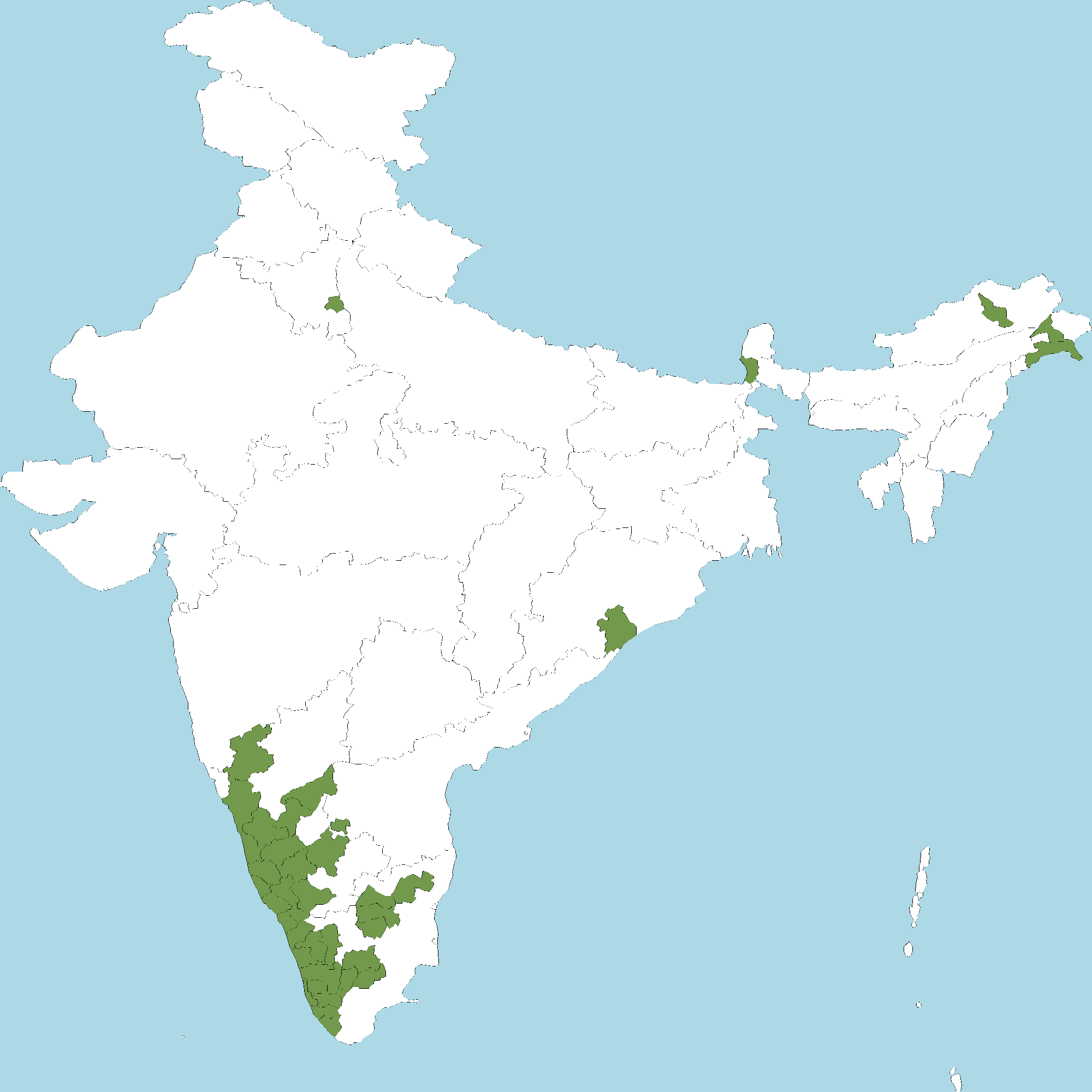 - Karnataka : Belagavi district, Ballari district, Chikkamagaluru district, Dakshina Kannada district, Davanagere district, Hassan district, Kodagu (Coorg) district, Mysuru district, Shivamogga district, Tumakuru district, Udupi district, Uttara Kannada district