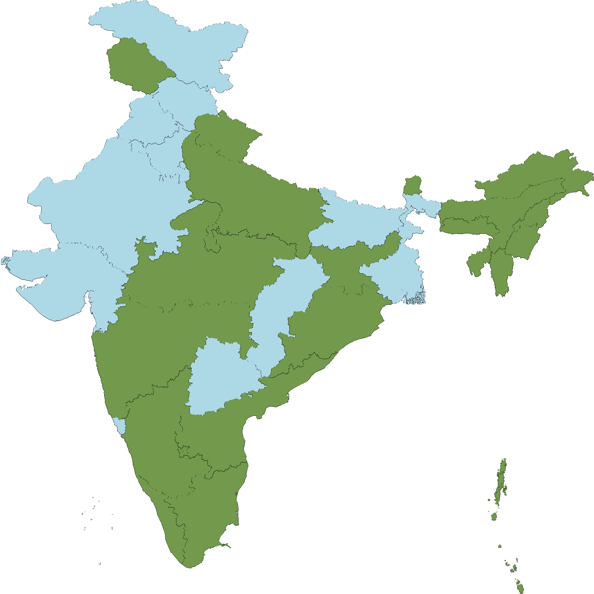 Andhra Pradesh : Throughout Andhra Pradesh  Karnataka : Bengaluru district, Belagavi district, Bidar district, Chikkamagaluru district, Davanagare district, Kalaburagi (Gulbarga) district, Hassan district, Kodagu (Coorg) district, Mysuru district, Raichur district, Shivamogga district, Uttara Kannada district, Dakshina Kannada district  Kerala : All districts of Kerala  Maharashtra : Akola district  Odisha : Throughout Odisha  Tamil Nadu : All districts of Tamil Nadu  Jharkhand :   Madhya Pradesh : Hoshangabad district  Uttarakhand : Uttarakhand  Sikkim : Sikkim  Arunachal Pradesh : Changlang, Kameng, Lohit, Siang, Subansiri, Tirap  Meghalaya : Meghalaya  Assam : Assam  Nagaland : Nagaland  Uttar Pradesh : Uttar Pradesh  Jammu and Kashmir : Jammu and Kashmir  Mizoram : Mizoram  Andaman and Nicobar Islands : Andaman and Nicobar Islands  Manipur : Manipur  Tripura : Tripura