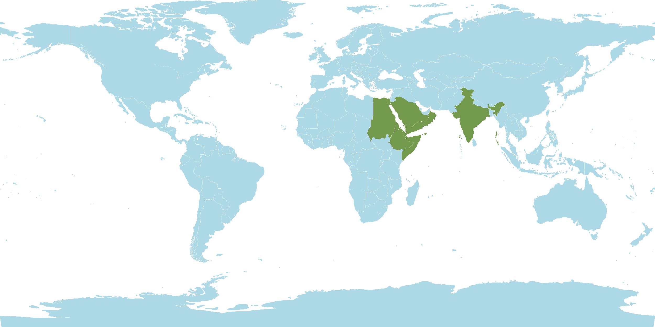 - World Distribution : Djibouti, Egypt, Eritrea, Ethiopia, Gulf States, India, Lebanon-Syria, Oman, Saudi Arabia, Somalia, Sudan, Yemen