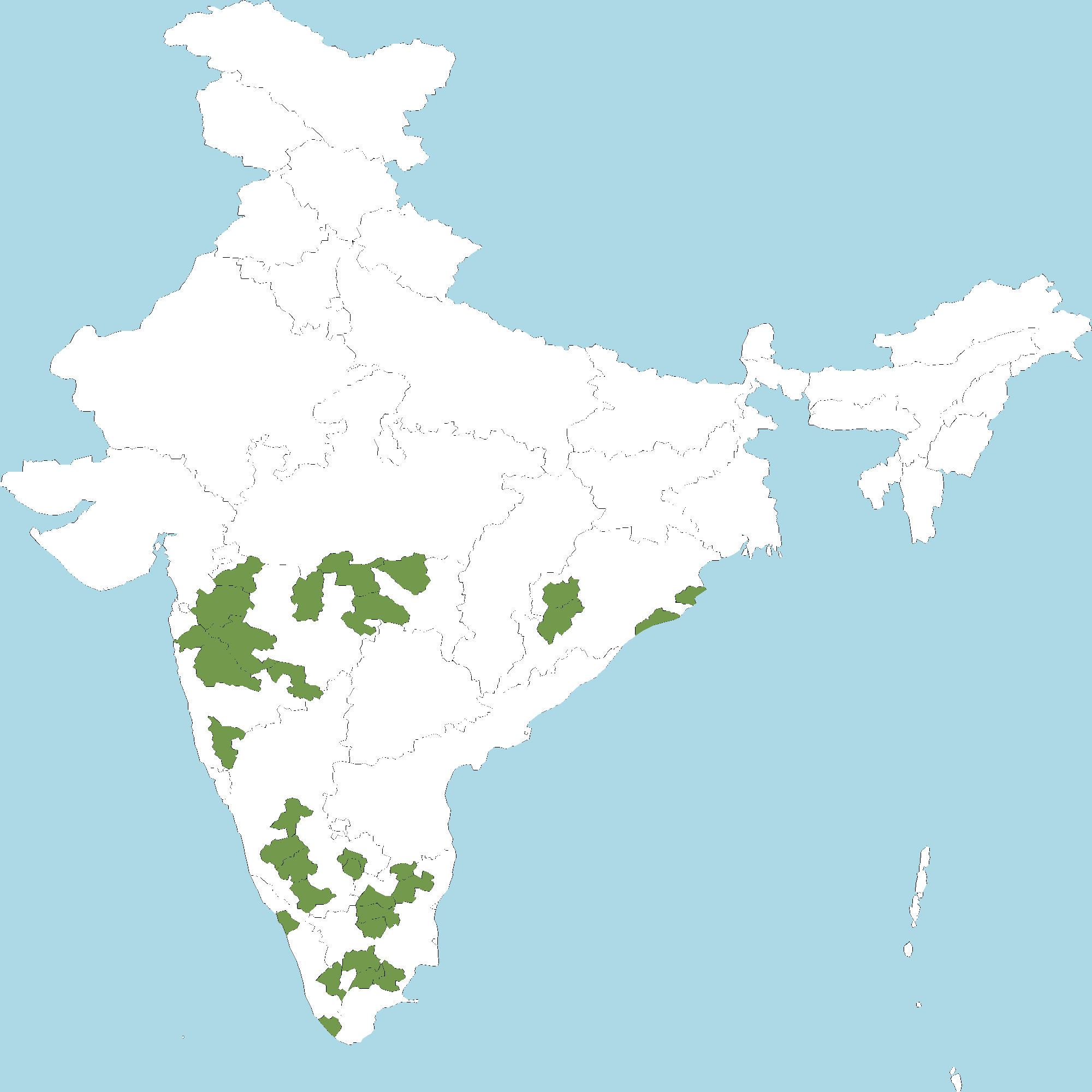 - Tamil Nadu : Alagar Hills (Madurai district), Kolli Hills (Namakkal district), Shevaroy Hills (Salem district), Kalrayan Hills (Salem district), Pachamalai Hills (Tiruchirapalli district), Bodamalai Hills (Salem district), Chitteri Hills (Dharmapuri district), Sirumalai Hills (Dindigul district), Yelagiri Hills (Vellore district, former North Arcot), Dharmapuri Hills (Dharmapuri district), Piranmalai Hills (Sivagangai district), Theerthamalai Hills (Dharmapuri district), Gingee Hill (Villupuram district), Javadhu Hills (Tiruvannamalai district, former North Arcot)