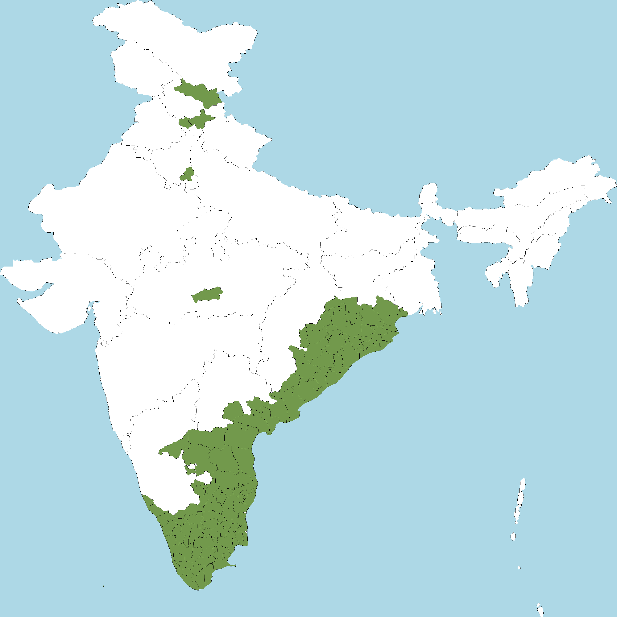 - Andhra Pradesh : Anantapur district, Chittoor district, Y.S.R. Kadapa district, East Godavari district, Guntur district, Krishna district, Kurnool district, S.P.S. Nellore district, Prakasam district, Srikakulam district, Visakhapatnam district, Vizianagaram district, West Godavari district