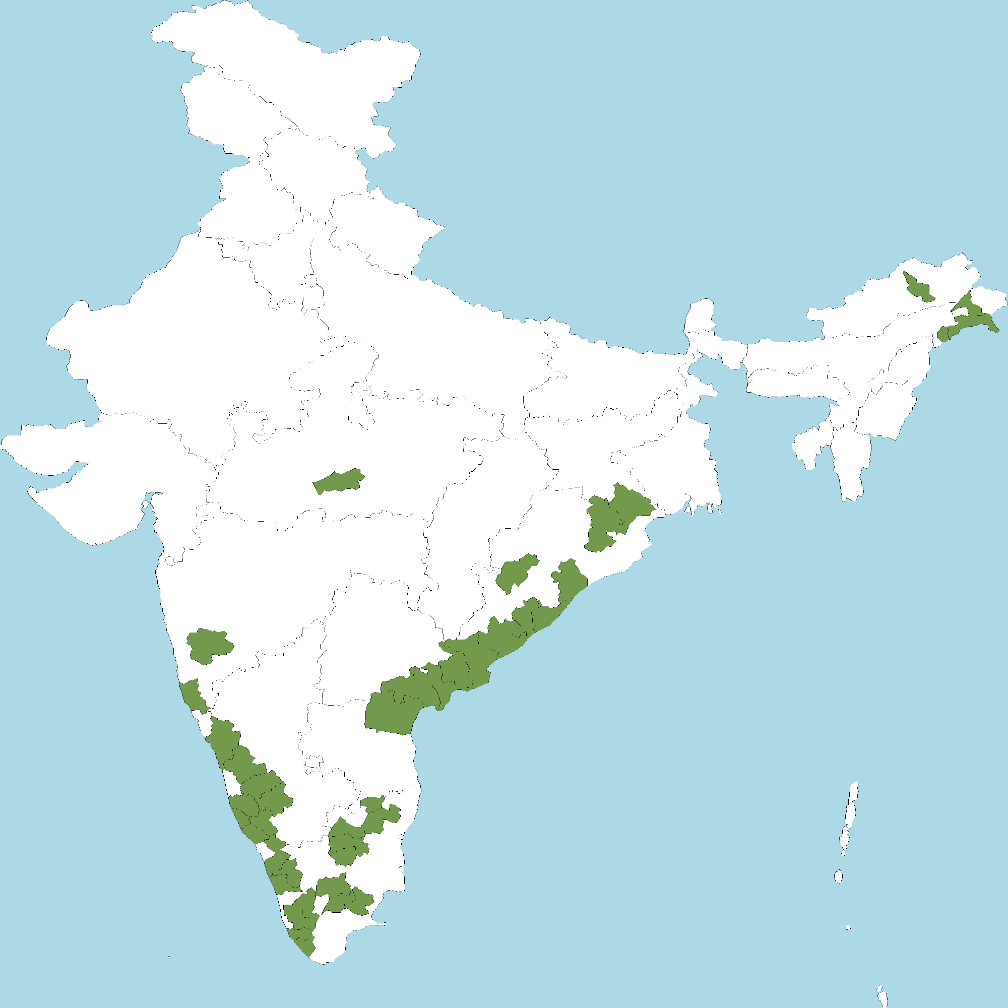 - Karnataka : Chikkamagaluru district, Dakshina Kannada district, Hassan district, Kodagu (Coorg) district, Shivamogga district, Uttara Kannada district