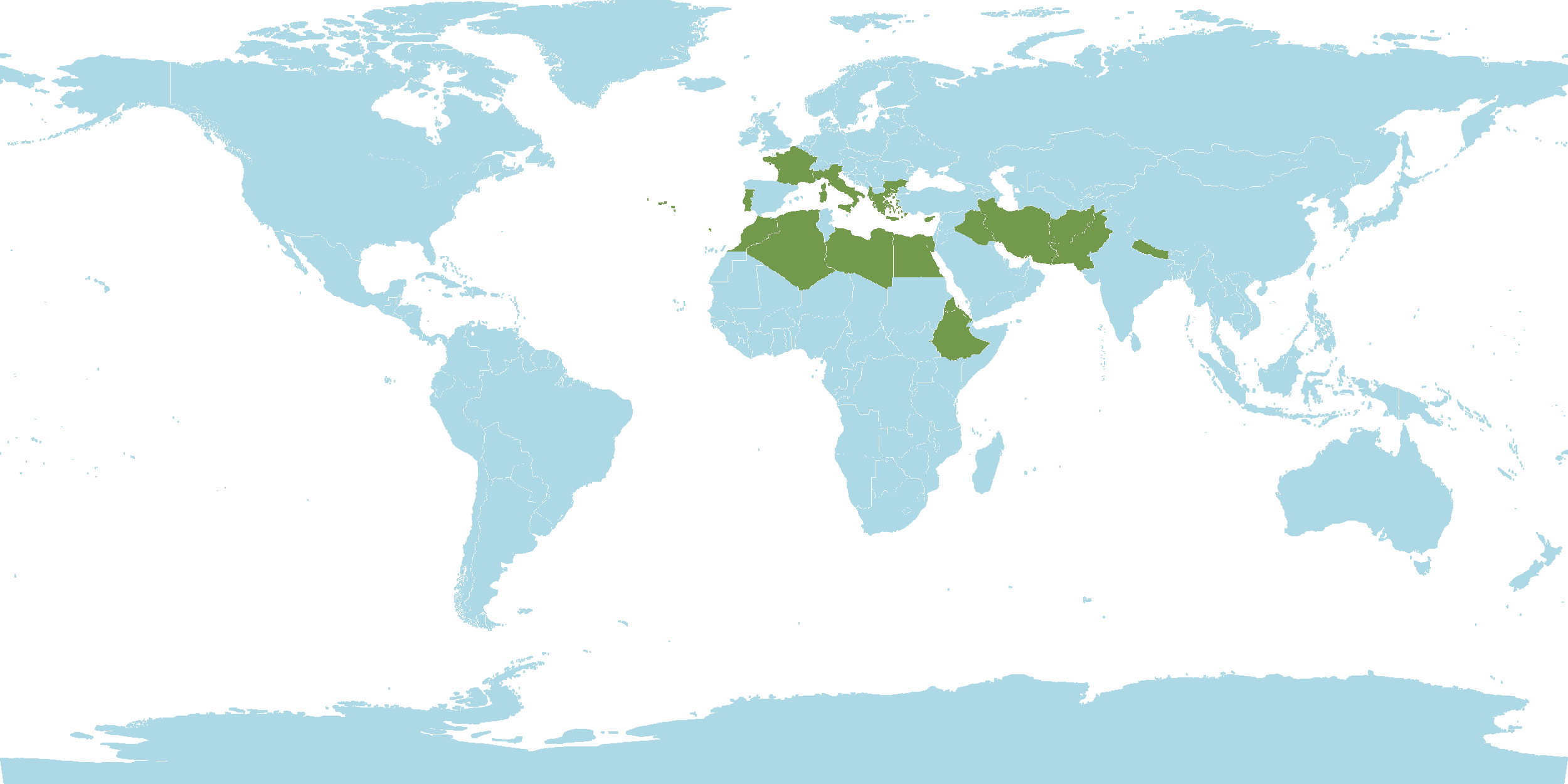 - Native : Afghanistan, Albania, Algeria, Baleares, Bulgaria, Corse, Cyprus, East Aegean Islands, Egypt, Eritrea, Ethiopia, France, Greece, Gulf States, Iran, Iraq, Italy, Kriti, Lebanon-Syria, Libya, Morocco, Nepal, North Caucasus, Pakistan, Palestine, Portugal, Sa