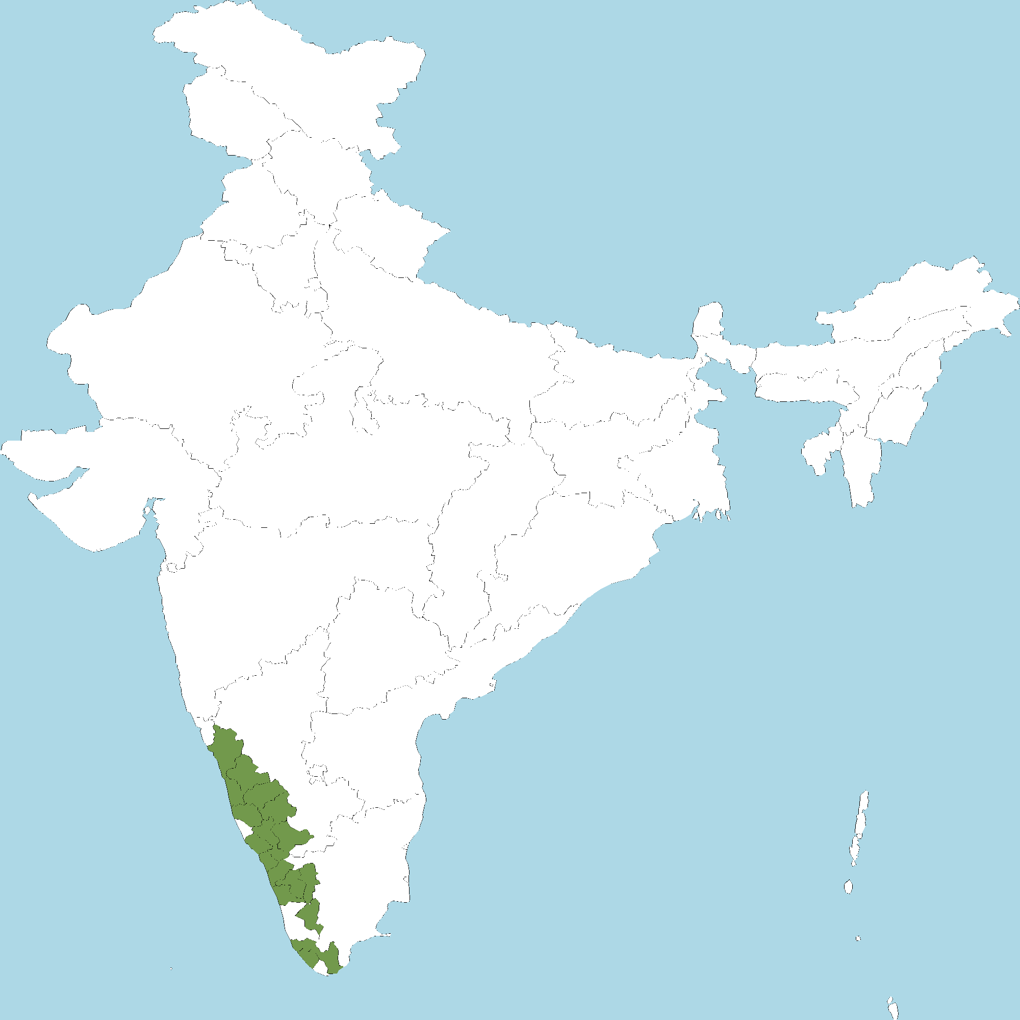 - Kerala : Kannur district, Wayanad district, Kozhikode district, Malappuram district, Palakkad district, Thrissur district, Idukki district, Kollam district, Thiruvananthapuram district