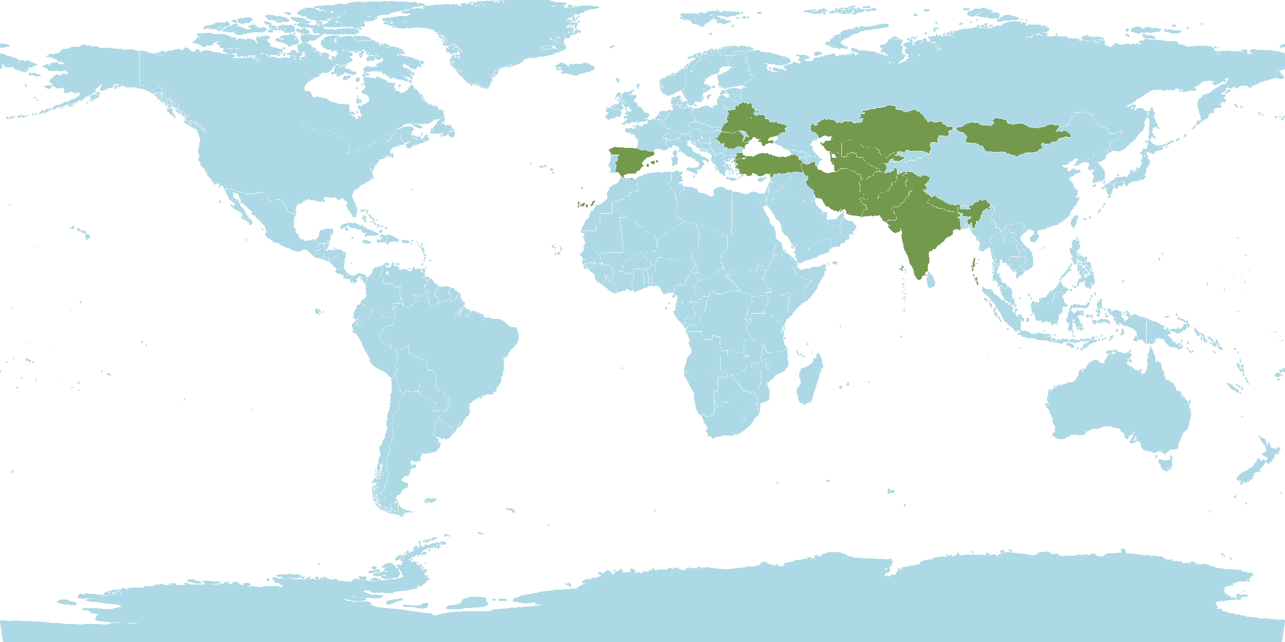 - World Distribution : Afghanistan, Altay, Belarus, Central European Russia, East European Russia, India, Iran, Kazakhstan, Kirgizstan, Krym, Mongolia, Nepal, North Caucasus, Pakistan, Romania, South European Russia, Spain, Tadzhikistan, Transcaucasus, Turkey, Turkmenistan, Ukraine, Uzbekistan, West Siberia, Xinjiang